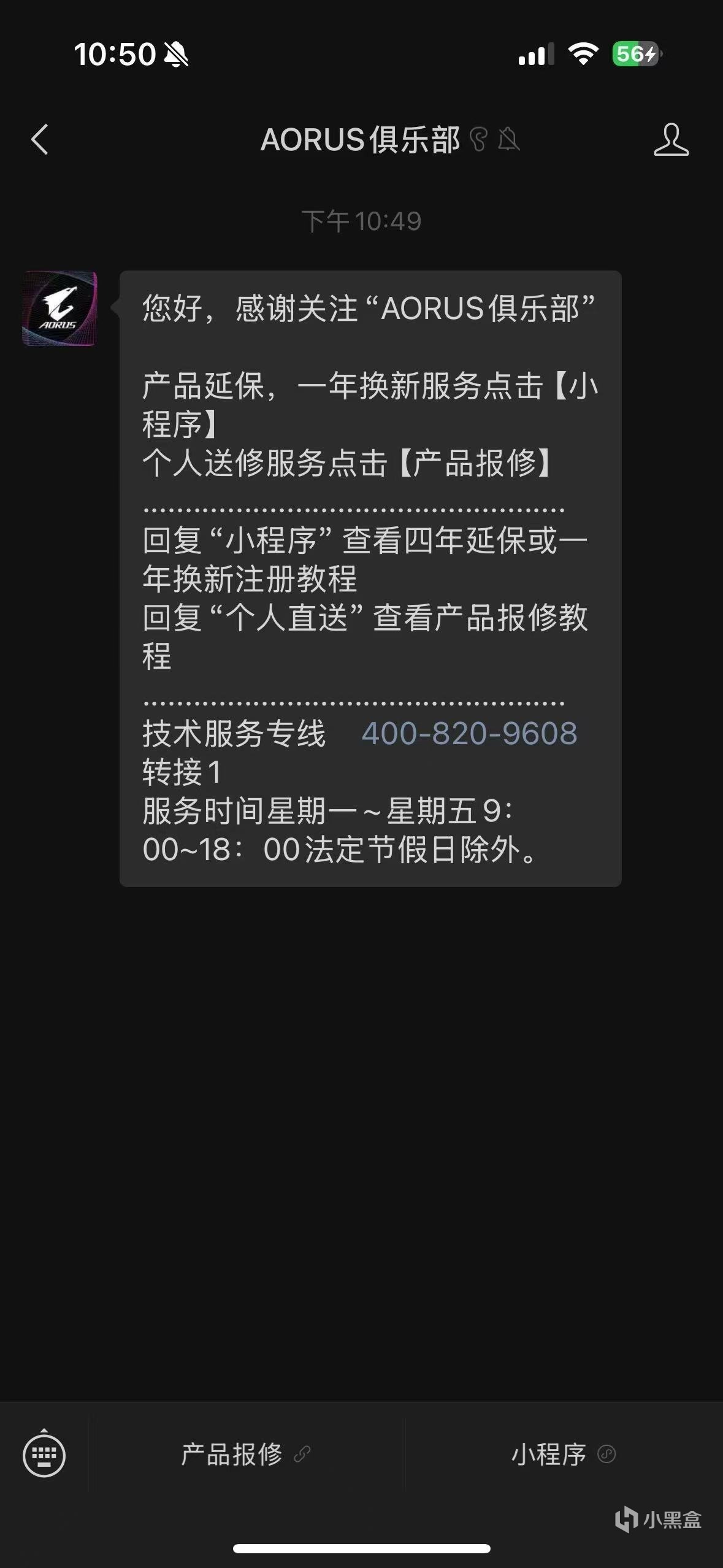 首先需要关注一下技嘉的售后服务号——AORUS俱乐部,关注完进去后,就会弹出产品延保、保修等常用服务的索引了。