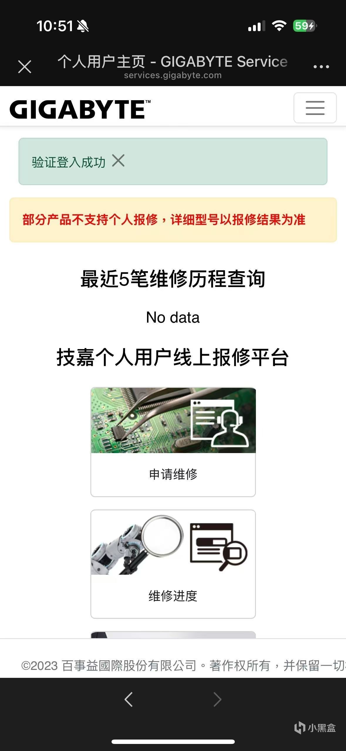 进入售后保修页面后,首先会需要先注册一下技嘉账号先,之前有注册的话可以直接登录,登陆后点“申请维修”。