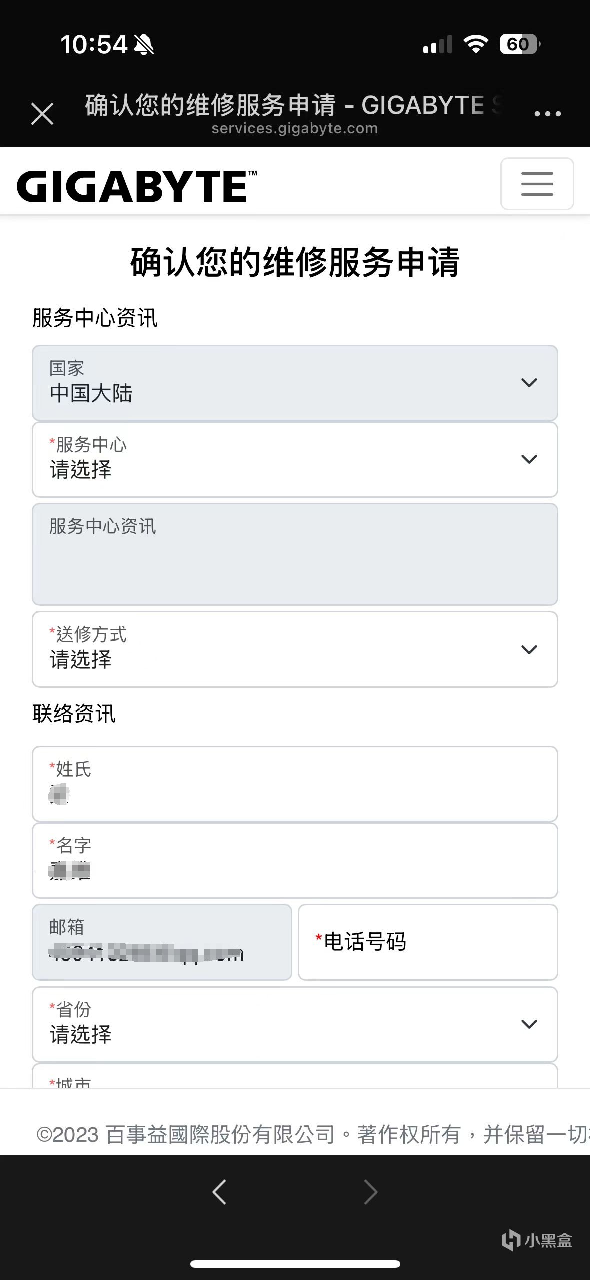 页面下方的“联络资讯”是我们收件的地址,也就是主板维修好后寄回的地址,快递单号为我们寄出到售后中心的单号(选择完服务中心后会跳出服务中心的寄件地址)。