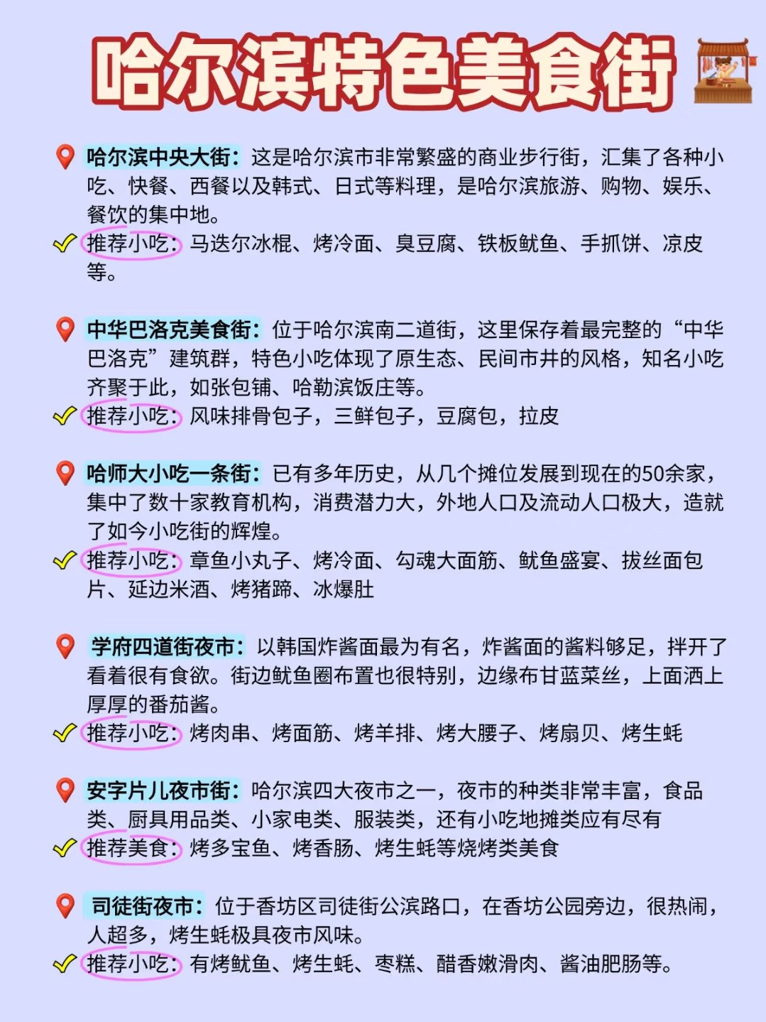 3️⃣哈师大小吃一条街:已有多年历史,从几个摊位发展到现在的50余家,集中了数十家教育机构,消费潜力大,外地人口及流动人口极大,造就了如今小吃街的辉煌。
