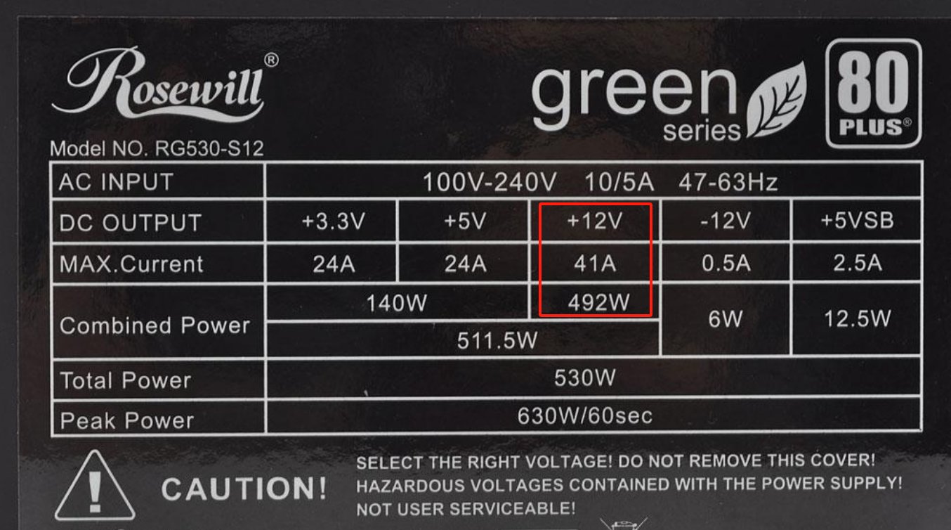 你只需要找到+12V這一欄,乘以下面的電流,就算出了這個電源額定多少瓦