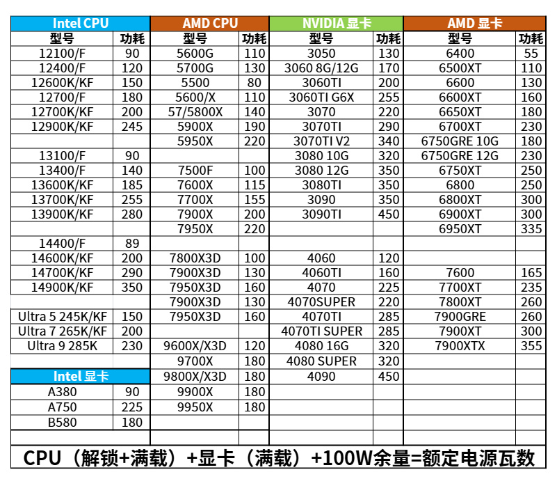 接着根據主流硬件功耗表,查看自己都能升級到哪些顯卡: