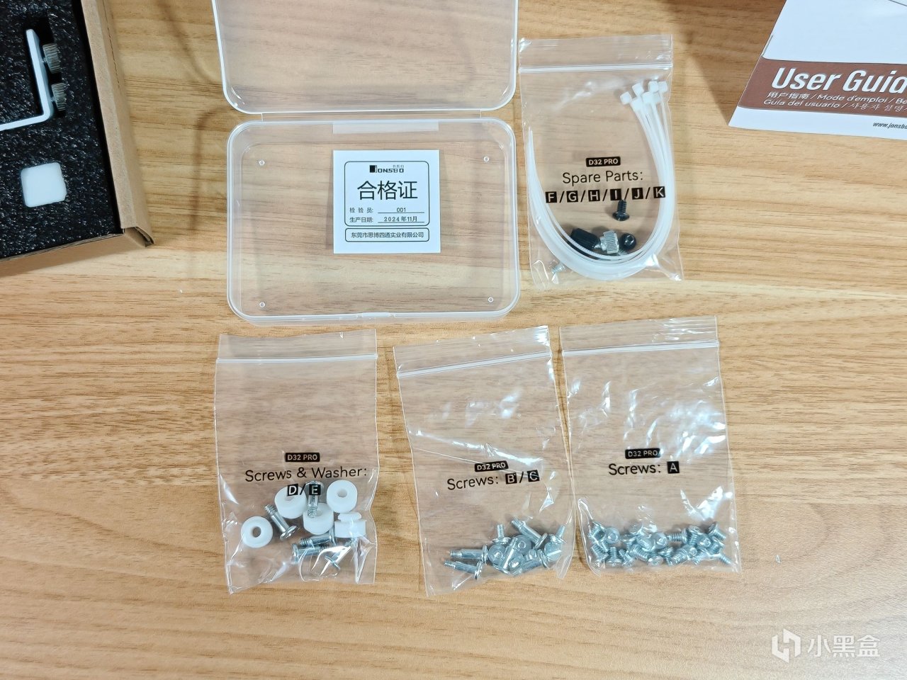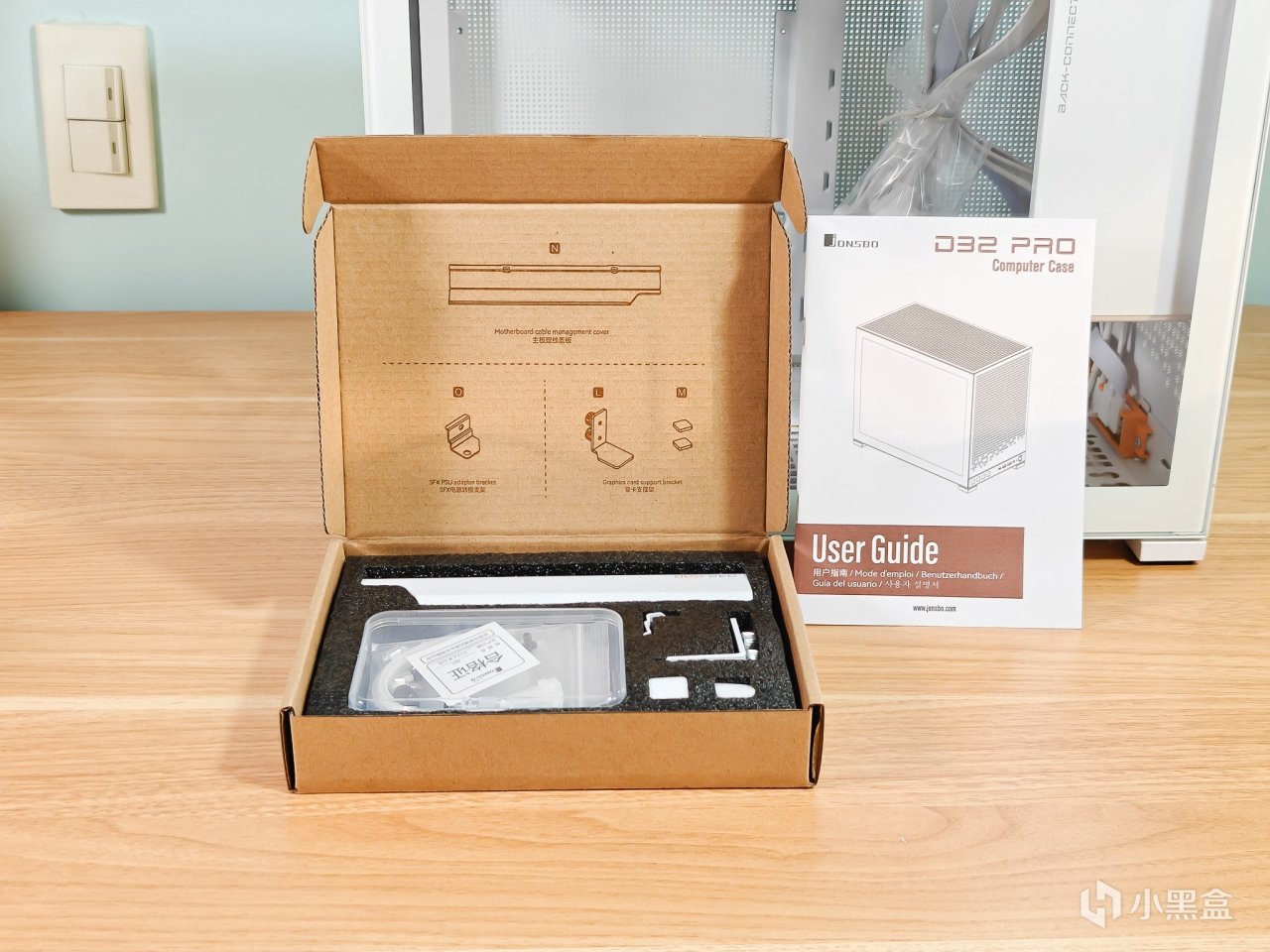 再來看看附件,有個漂亮的配件盒,可以看見有線槽、顯卡支架和螺絲盒。還有彩色的安裝說明書。