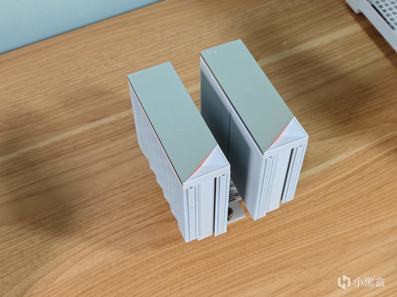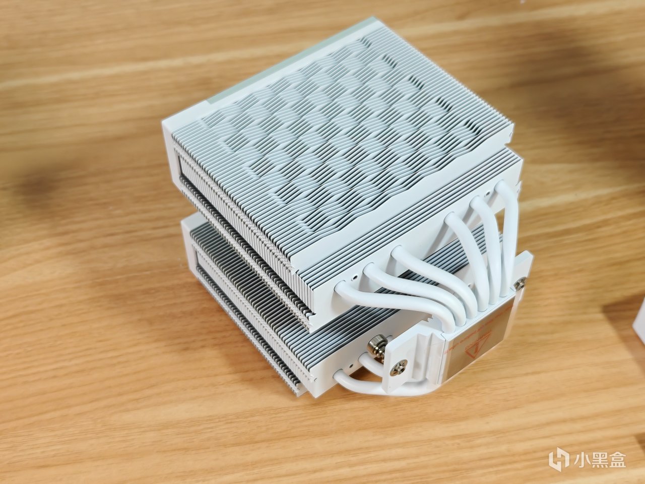 雙塔散熱器,採用了扣FIN和折FIN工藝。同時,它的鰭片呈現波浪狀的樣子,這個也是三角幾何元素,這個不僅僅是有特色,有動感,更是根據氣動聲學精心設計的,可以起到改善散熱、減少噪音的作用。6根6mm熱管,全新研發的精密熱管,無論垂直還是水平安裝均可以發揮良好散熱水平。微凸CD紋純銅底座,可以有效貼合CPU,迅速傳導熱量。