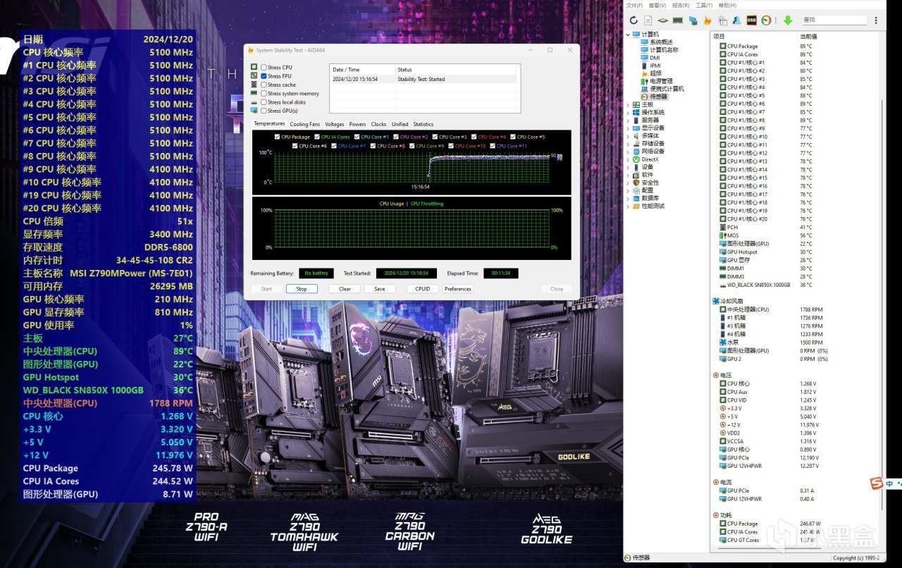 AIDA64 FPU測試,跑了10分鐘後,看到非常穩定。功耗245W,溫度89度。CPU電壓1.258V,毫無壓力。
