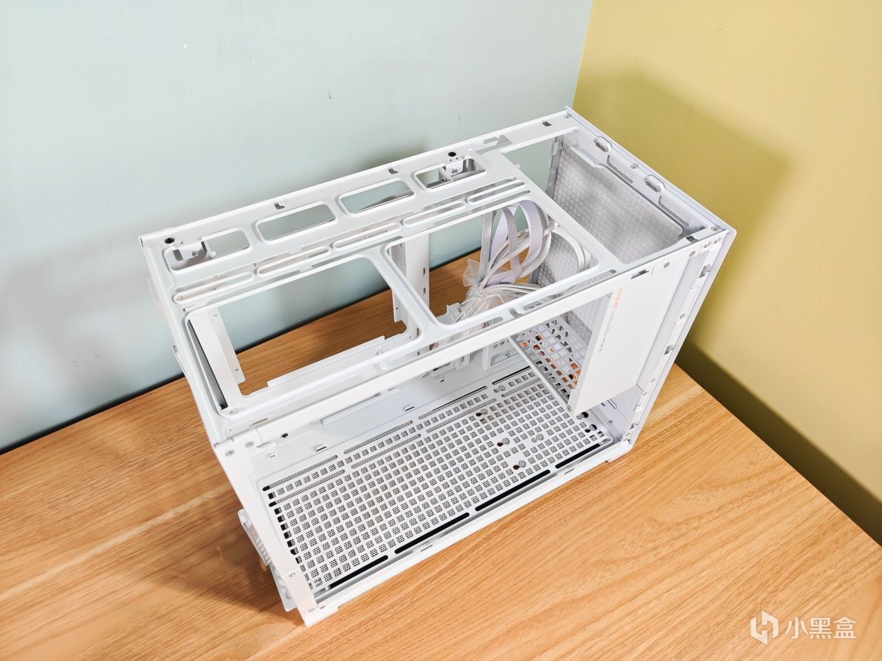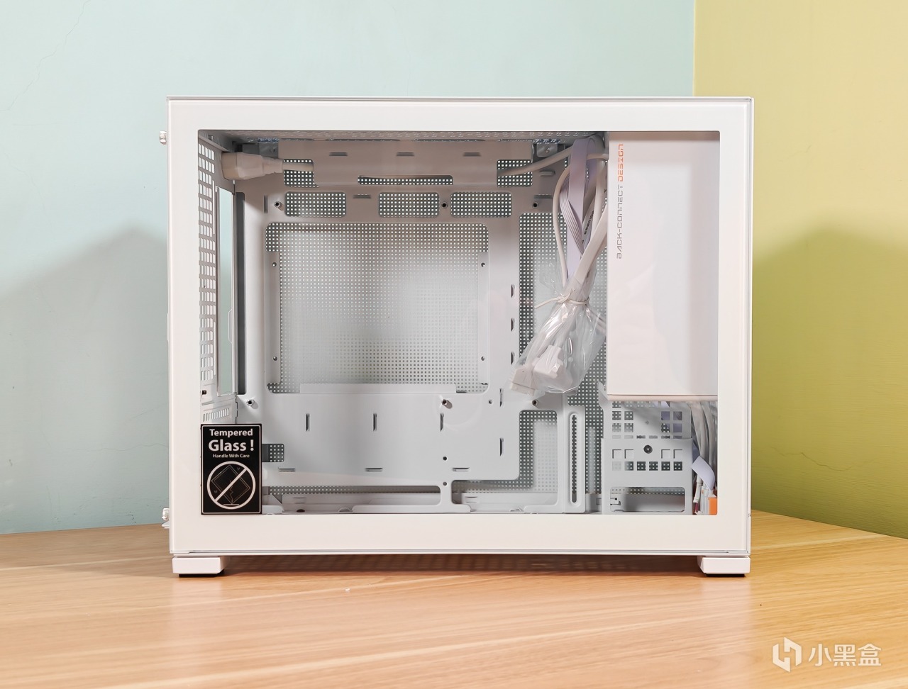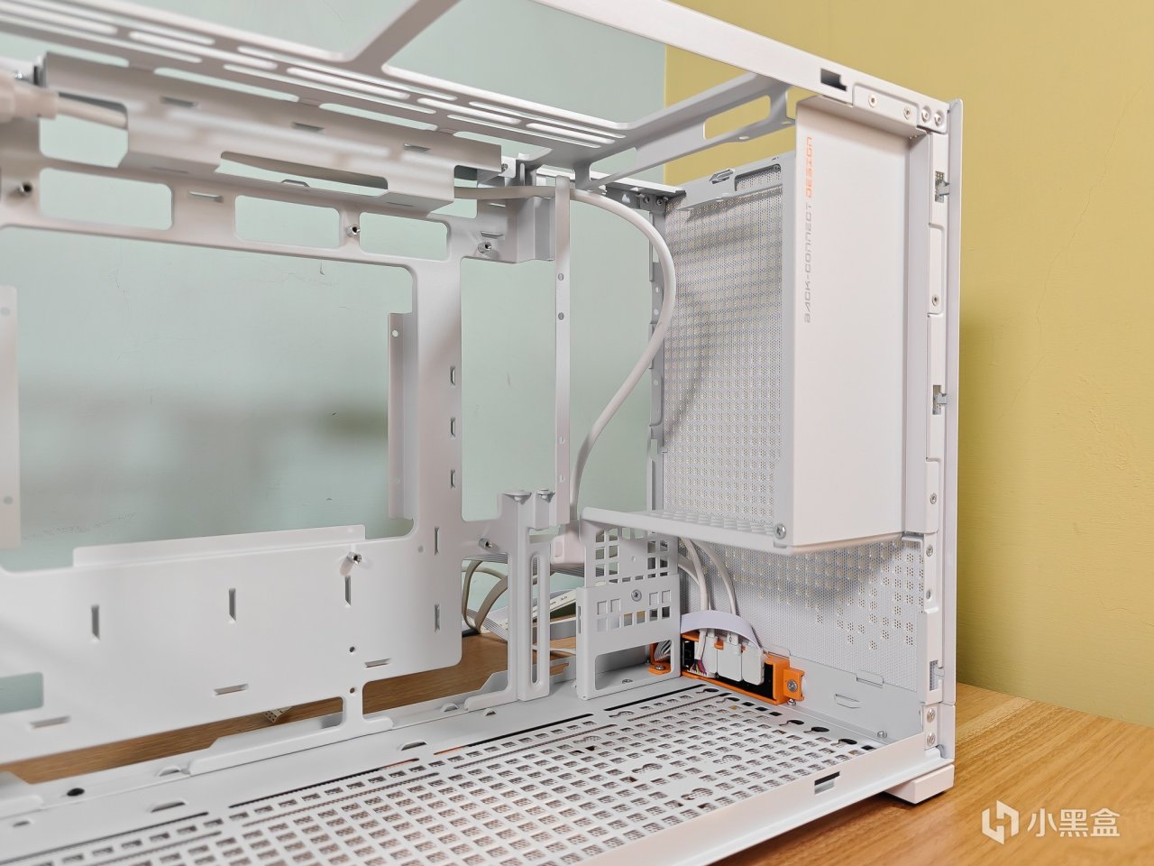 從左側面看,這個是全尺寸的側透玻璃,四邊有白色,可以遮擋住邊上,更加美觀。右側的白色是電源位置,這個是擋板,可以擋住電源和走線,更加美觀。上部有一根線引導到電源倉的位置。