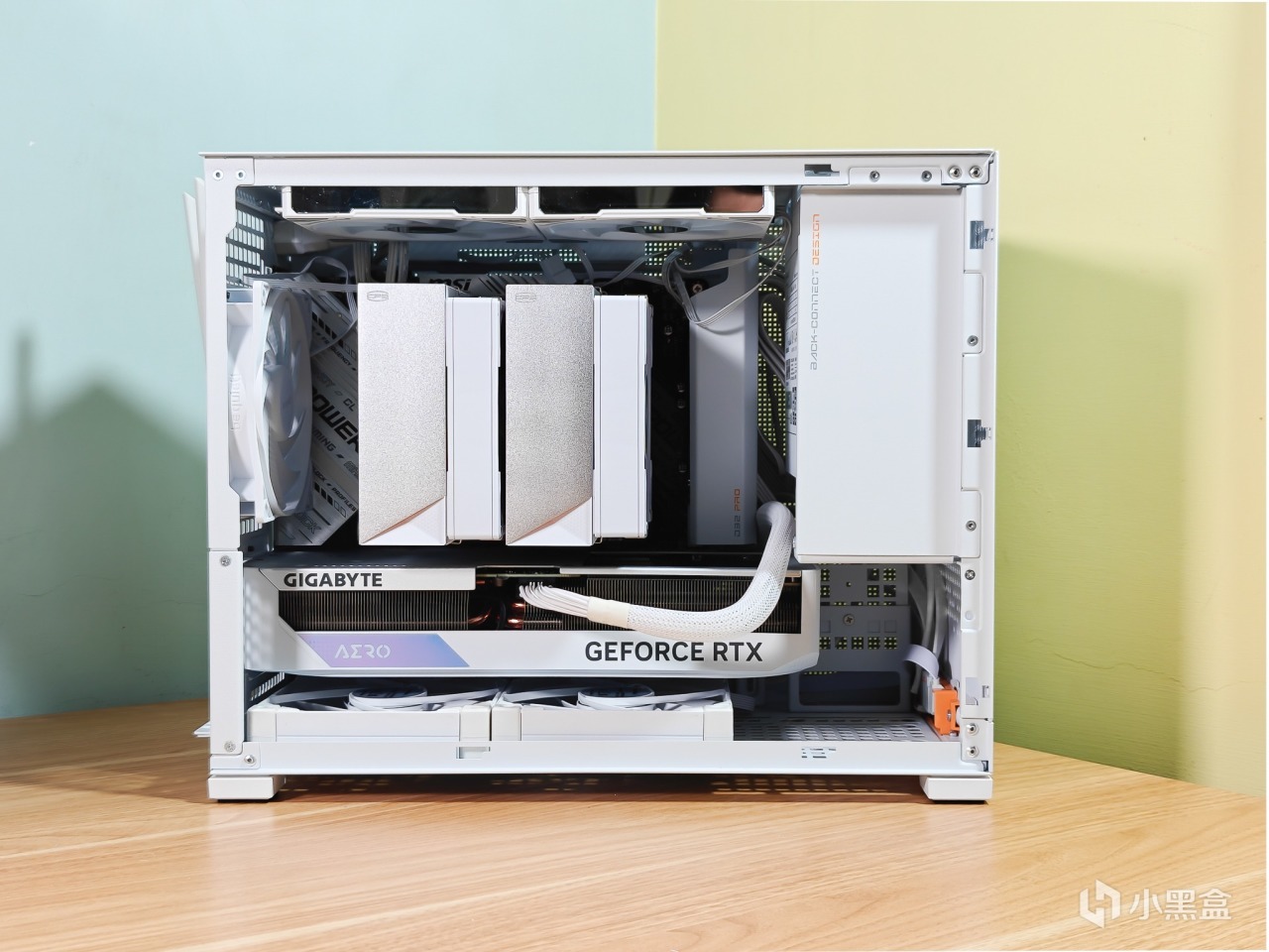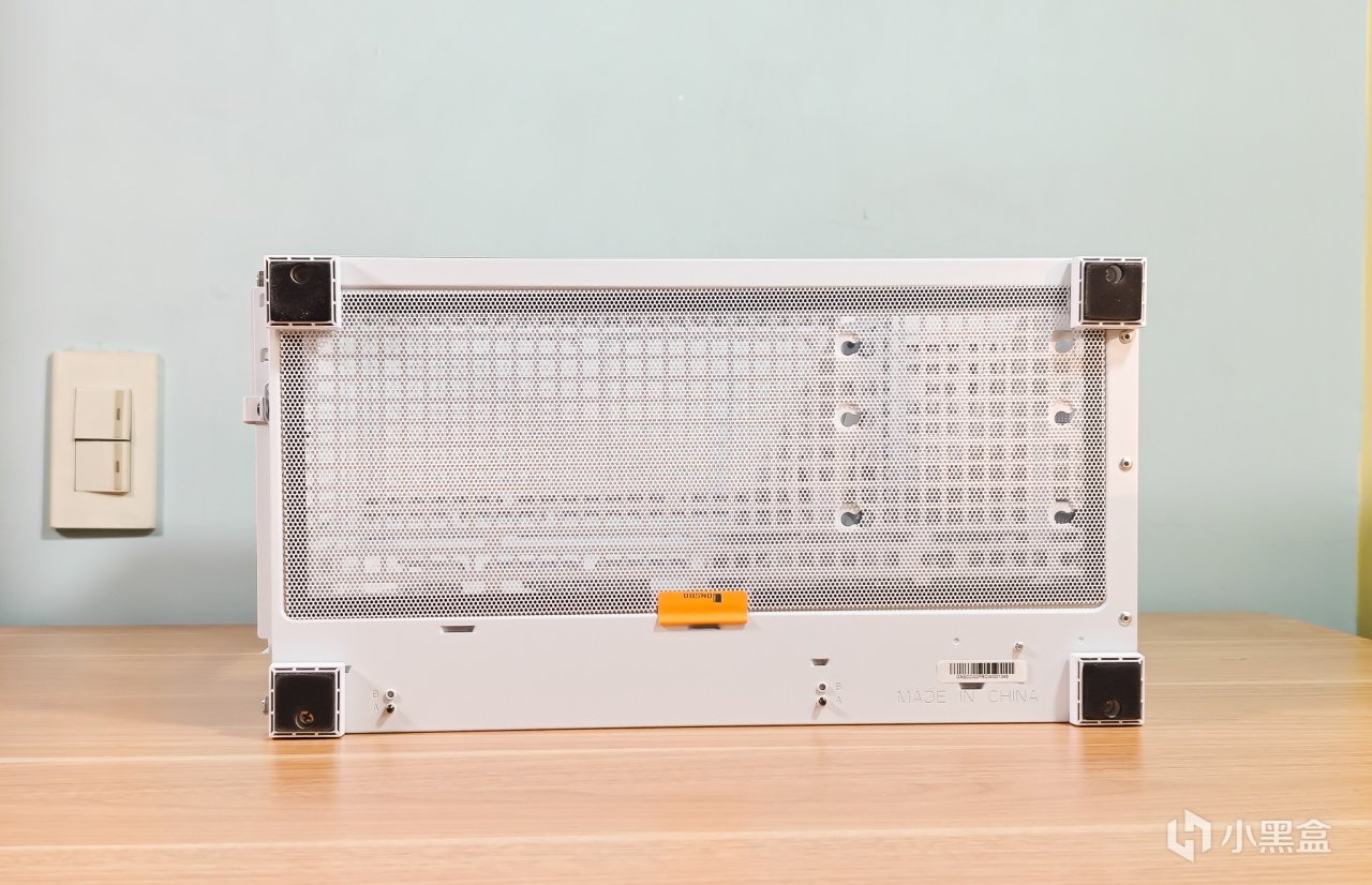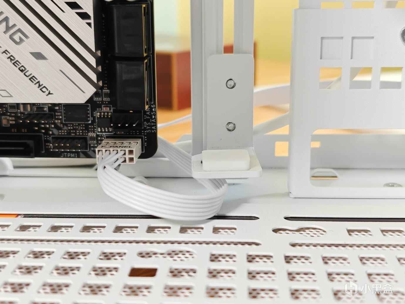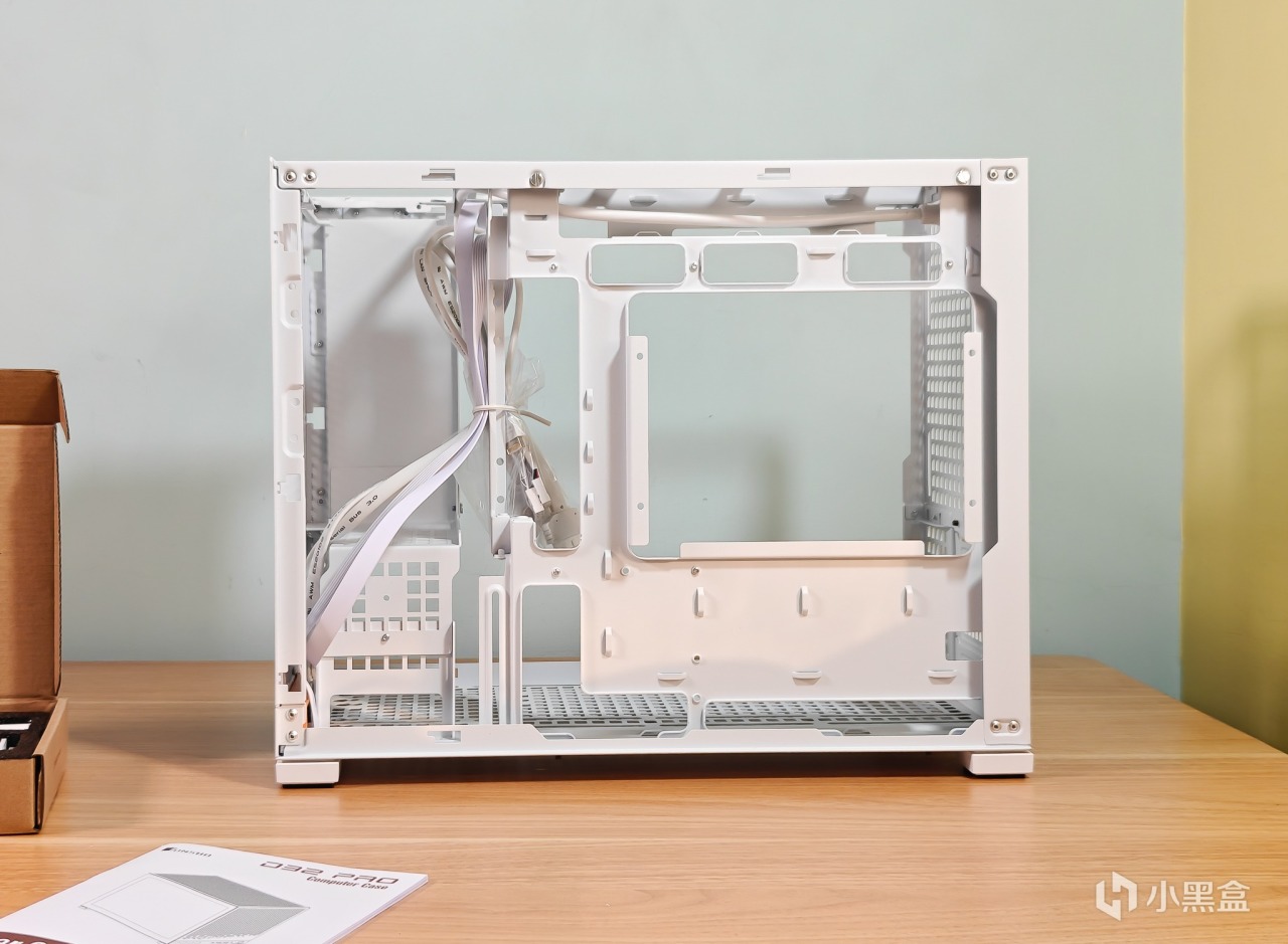 從左側面看,這個是全尺寸的側透玻璃,四邊有白色,可以遮擋住邊上,更加美觀。右側的白色是電源位置,這個是擋板,可以擋住電源和走線,更加美觀。上部有一根線引導到電源倉的位置。