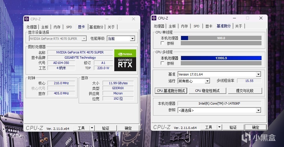 顯卡,RTX4070 SUPER,技嘉。CPU-Z跑分單核900,多核13995.9。