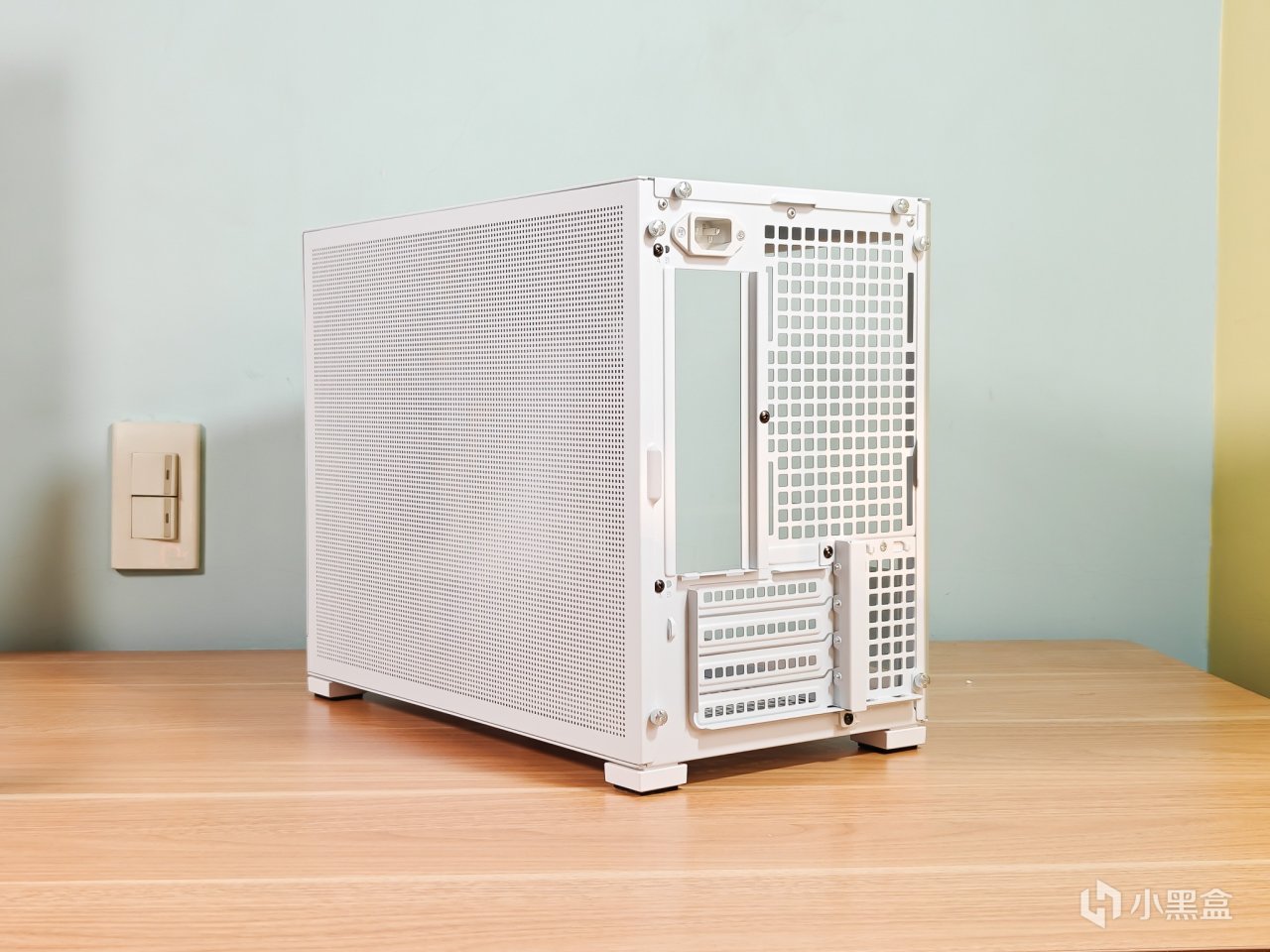 機箱的左側都是通氣孔,後部可以看見,最上面是電源線接口,中間是有一個風扇位置和IO接口。下部是4個PCIE插槽。這款機箱的一個特色是還支持背插主板,並且有A模式和B模式,默認是A模式支持普通主板,通過移動部分部件,可以實現支持背插主板,就是B模式。