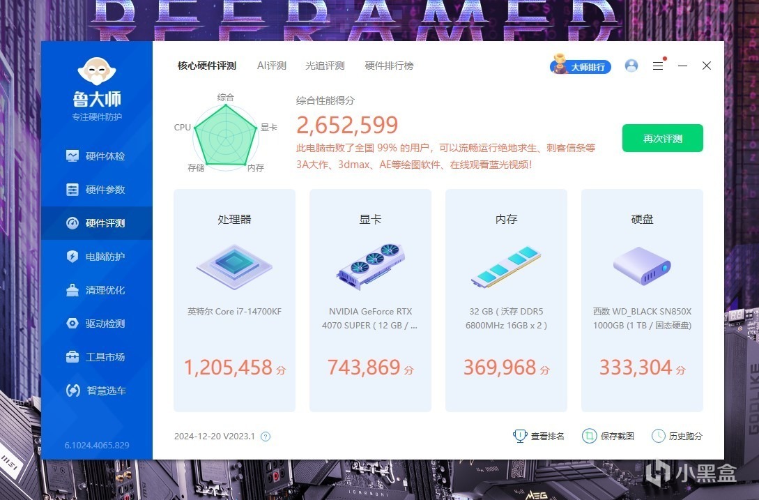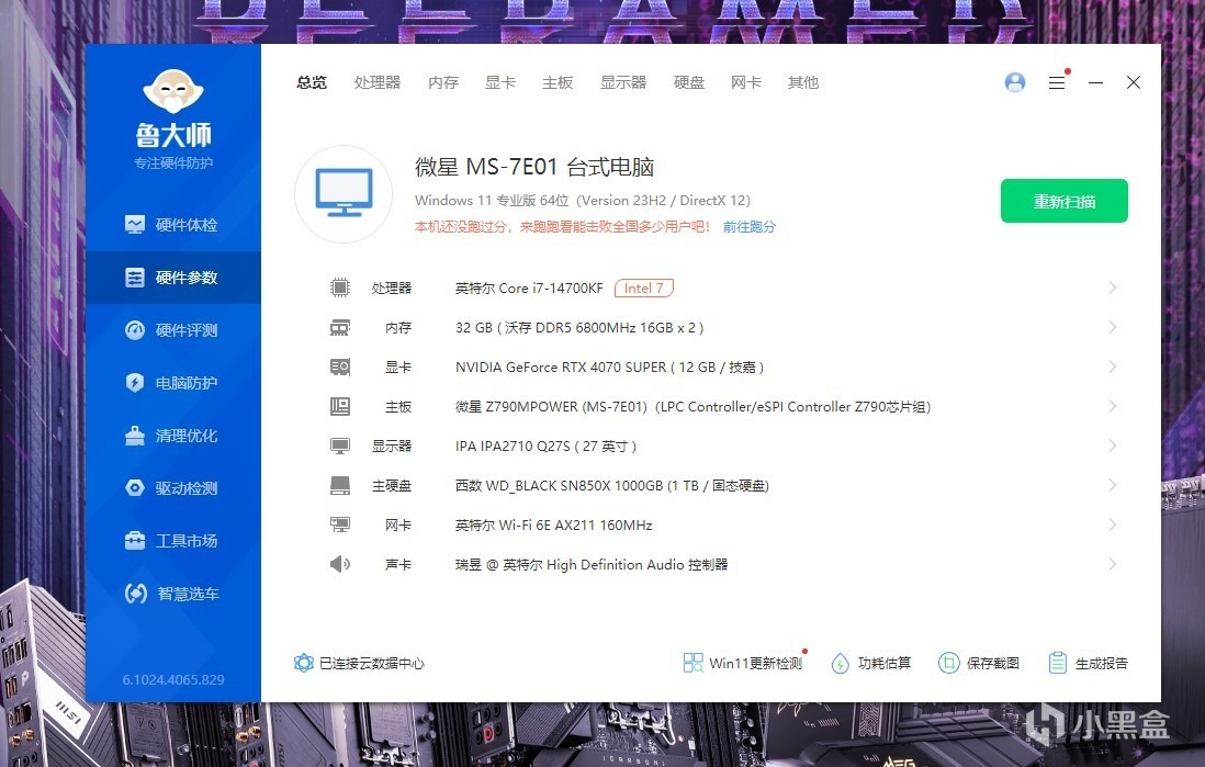 運行魯大師,看到CPU是i7-14700KF,內存是沃存DDR5 6800MHz,顯卡是技嘉的RTX 4070 SUPER,主板是微星的Z790MPOWER。