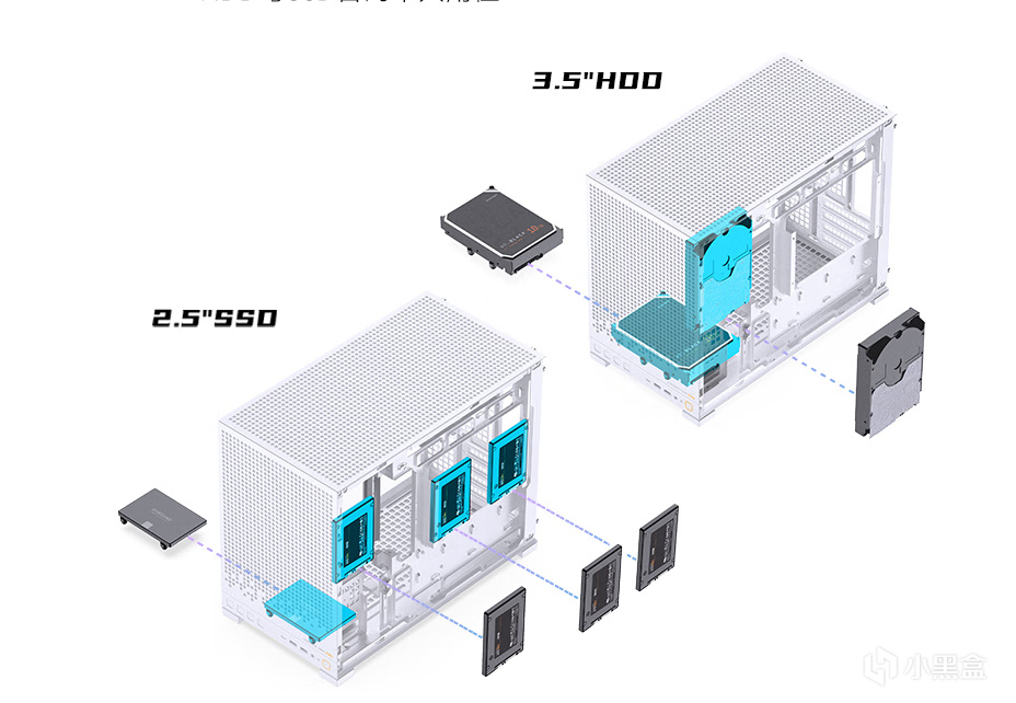 從左側面看,可以看到電源線延長線從右側一直延伸到了左側,是線槽走的。這裏左側有一個2.5英寸/3.5英寸硬盤位置,右側有2個2.5英寸硬盤位置。