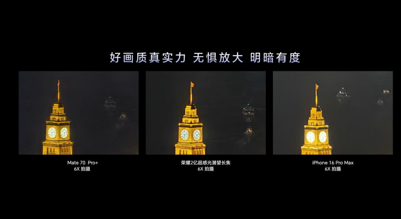 夜間6x模式下,與華爲Mate 70 Pro+和iPhone 16 Pro Max相比,榮耀Magic7 RSR保時捷設計款表現會更好。