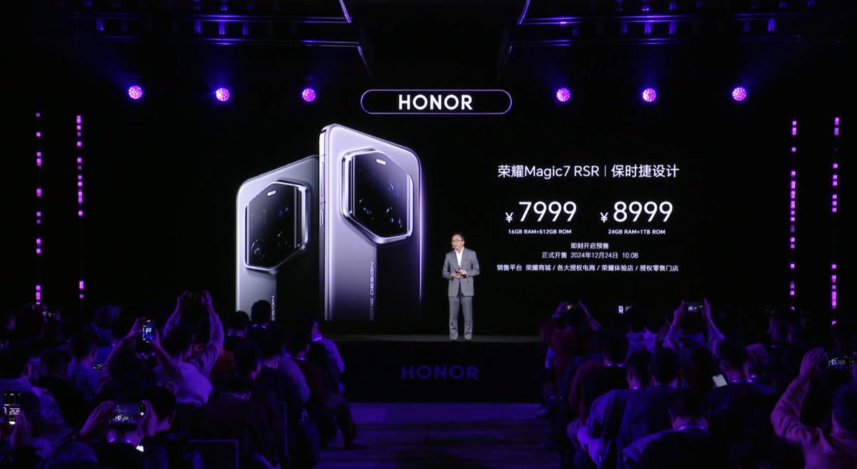價格方面,榮耀Magic7 RSR保時捷設計款16GB+512GB版本售價7999元,24GB+1TB版本售價8999元,即刻開始預售,正式發售時間爲將於12月24日早上10點08分。