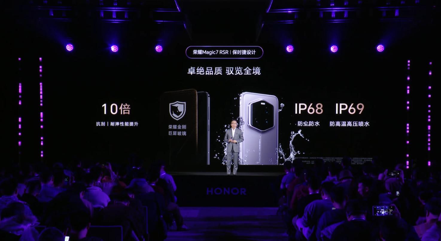 除此之外,榮耀Magic7 RSR保時捷設計款還將配備榮耀金剛巨犀玻璃,抗刮耐摔性能提升10倍,同時支持IP68和IP69級別防塵防水。