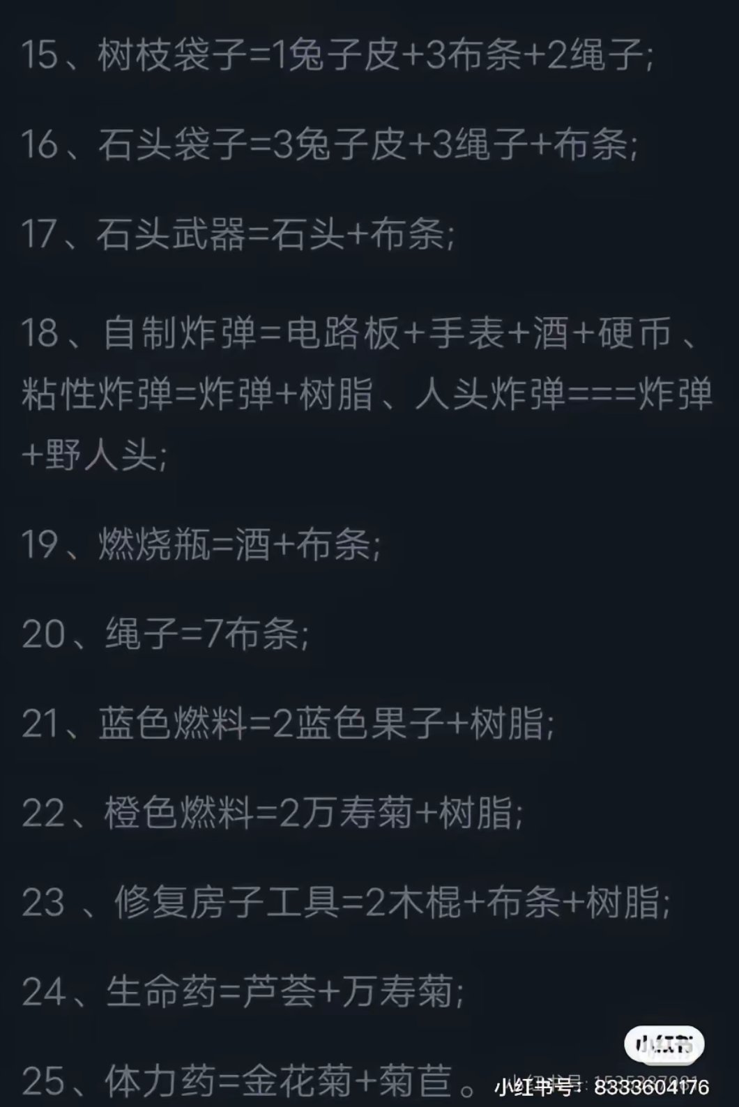 这些是《森林》游戏中部分合成物品的配方,希望对您有所帮助。如果您需要更多信息,可以继续探索游戏或者查看游戏内的合成手册。
