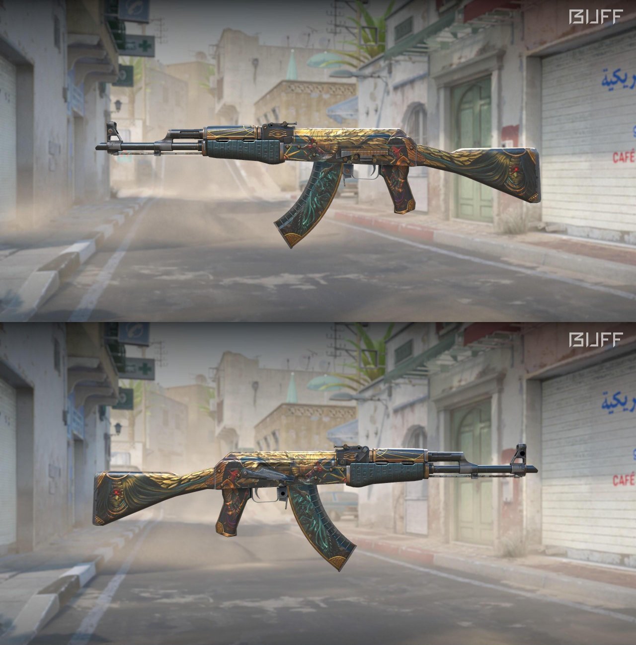 第一眼看上去让人很惊艳的一款皮肤,有一张贯穿整个枪身的黄金羽,羽翼下还藏着胡狼阿努比斯,设计很精美,很耐看,效果也还不错,且不怎么吃磨损,只有亮度受一点影响,推荐略磨入手,暗金(103😱)