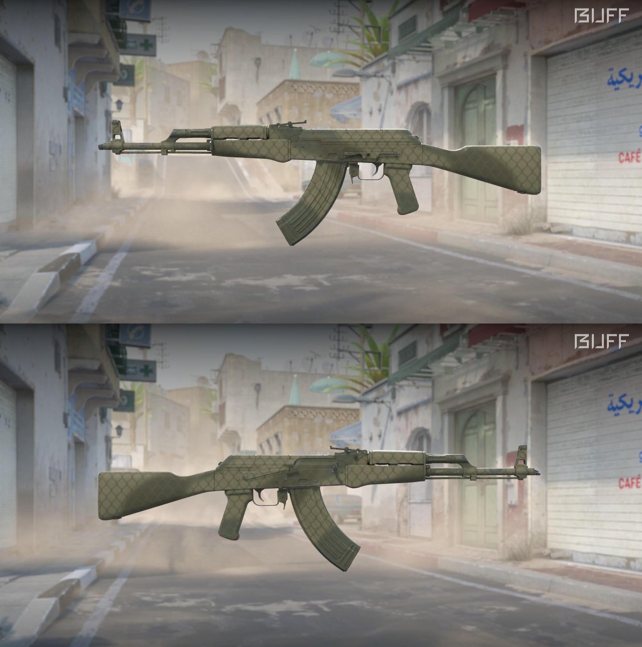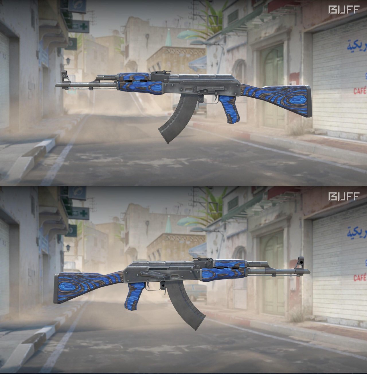 靠近枪口处,枪托和握把处都有蓝色深纹,中间则是和墨岩很类似的深底色,可以搭配一些好看的印花,效果或许会很不错,不吃磨损,推荐久经入手