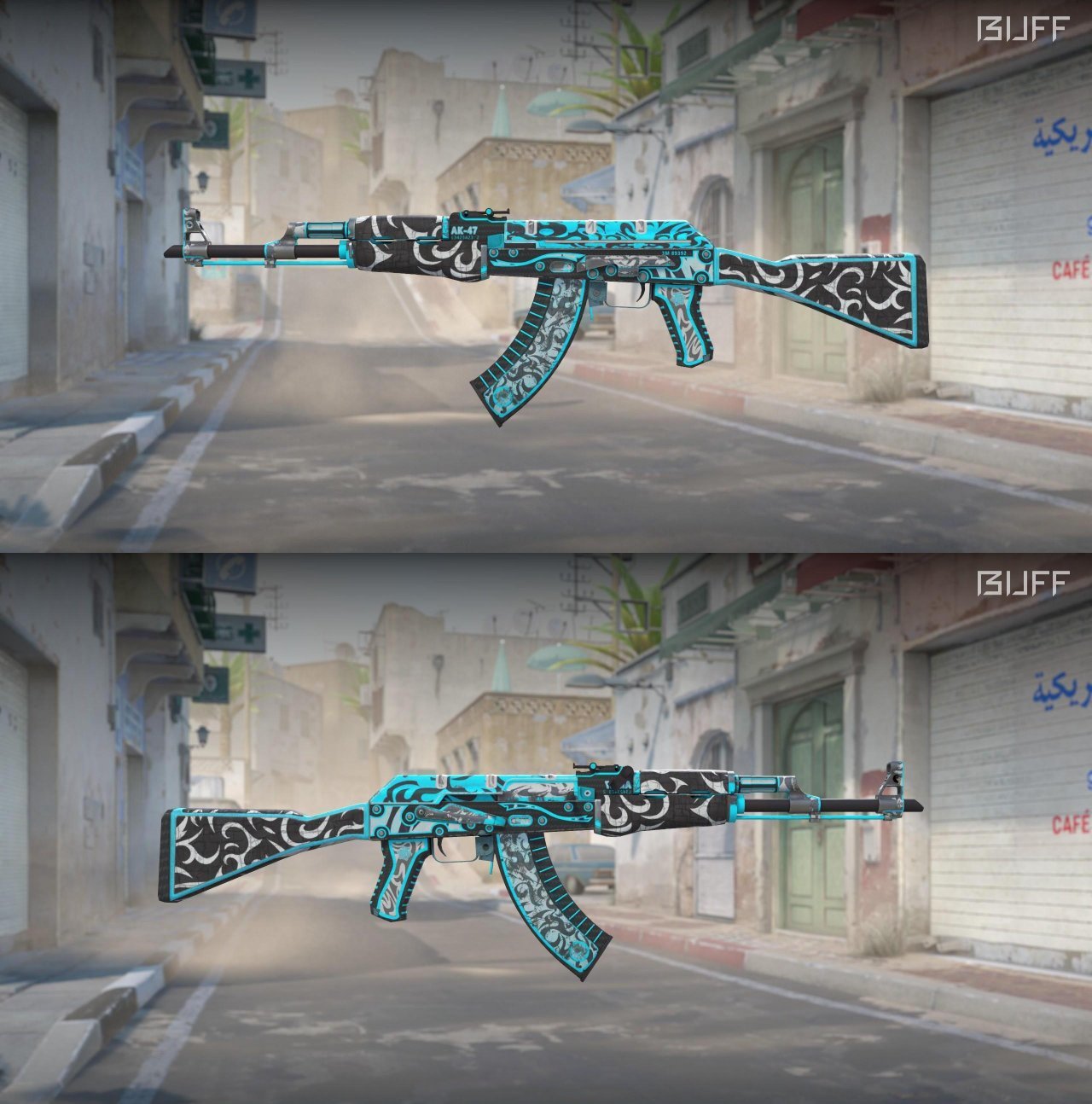 主体蓝色和黑色为底色,上面有白色图案点缀,就像是混杂其中的迷雾,很耐看,局内效果也很不错,有些吃磨损,枪身上会有一些刮花,推荐久经入手