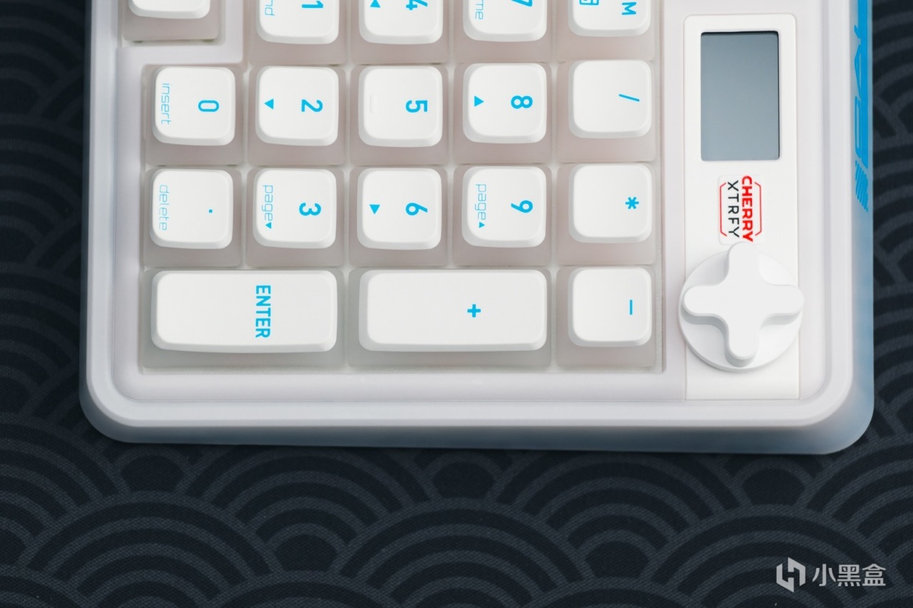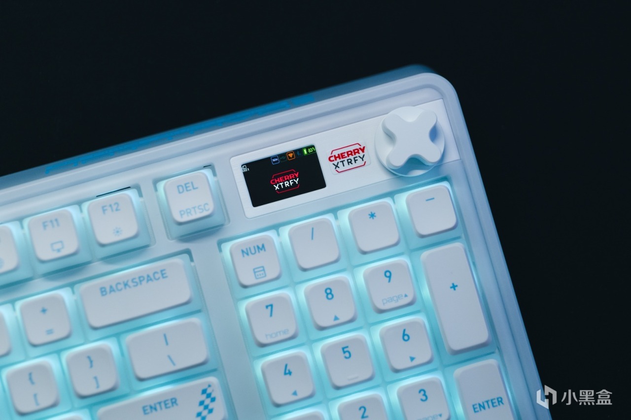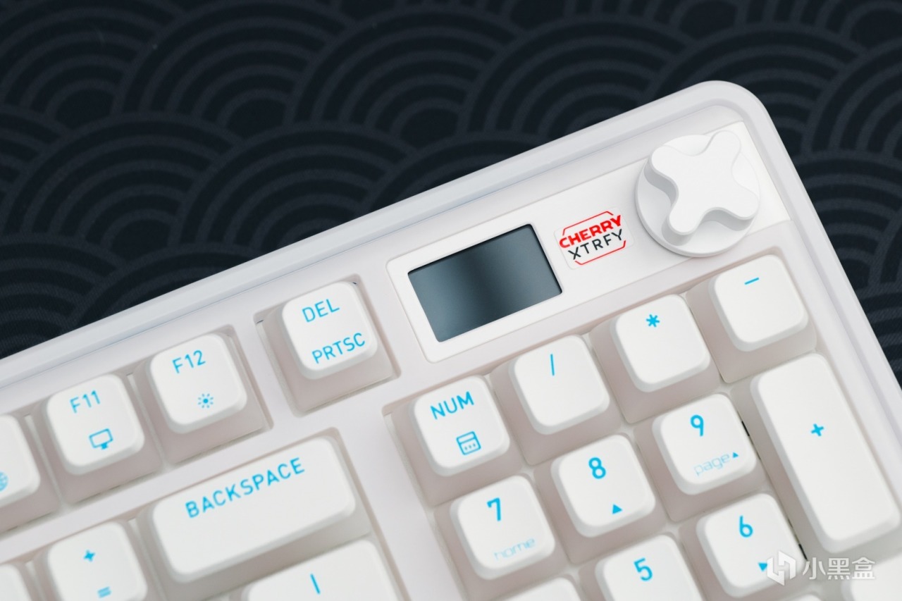 數字區上方採用的是和MX8.3一樣的全綵LCD顯示屏,搭配家族式X型金屬旋鈕,在旋鈕與屏幕之間還有CHERRY XTRFY的絲印logo。這個部分的飾板與邊框的銜接處有做圓弧過渡,使其看起來更加和諧。
