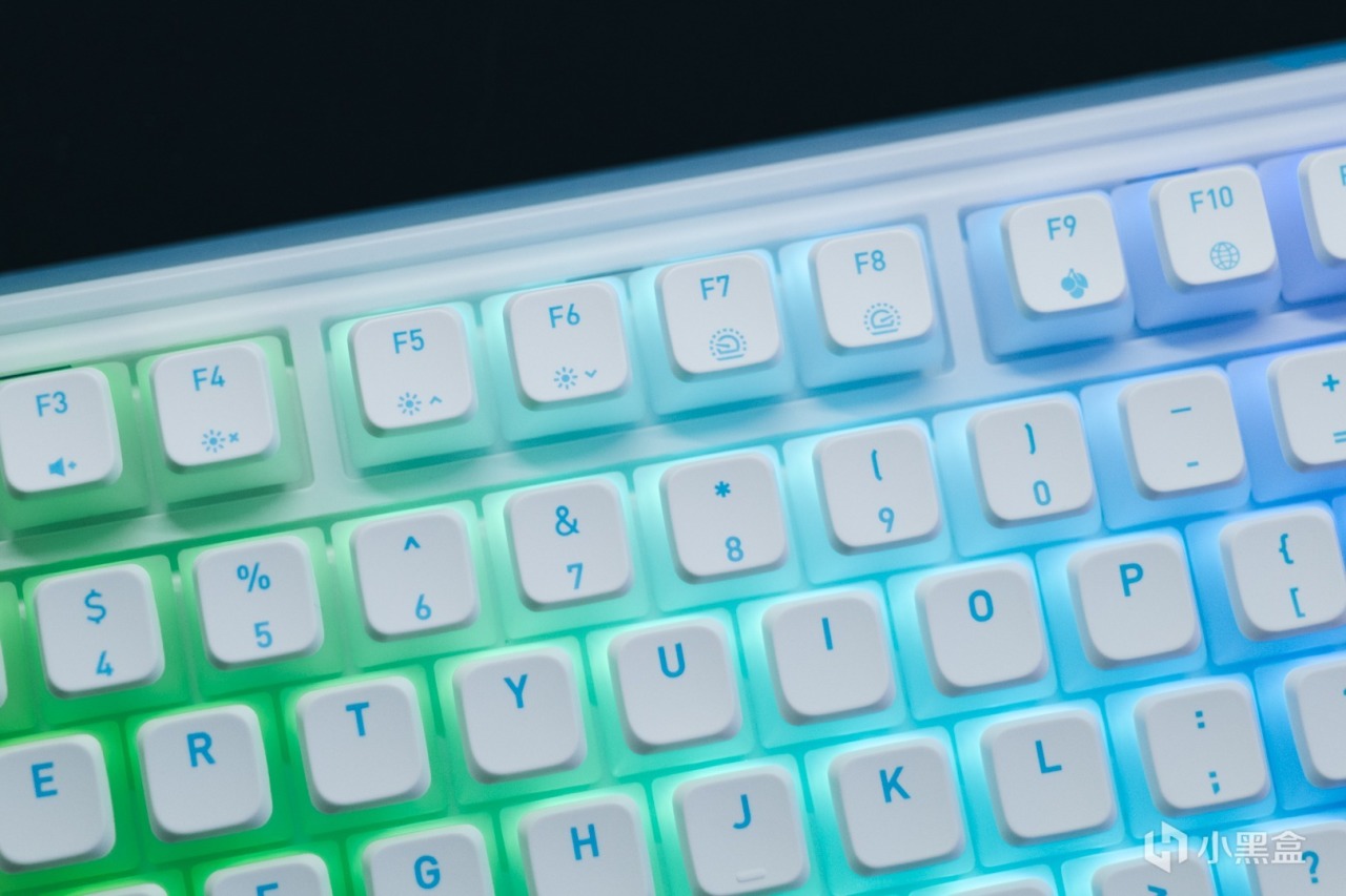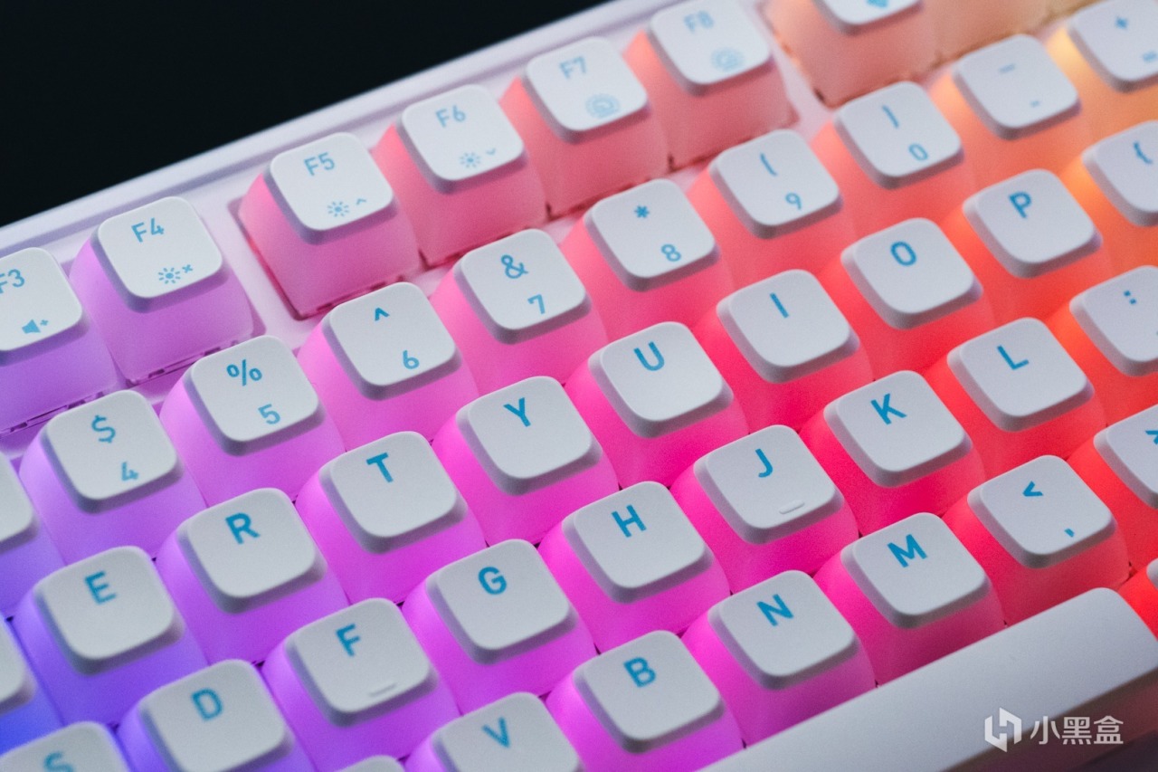 回到鍵盤正面,鍵帽方面PIXIU98採用的是霧透的布丁鍵帽,四面半透,頂部不透。頂部爲PBT材質,字符爲絲印工藝。部分按鍵還印有組合鍵標識。