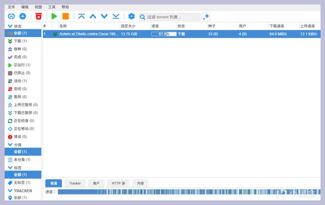 可以看到考斯使用qBittorrent下载,轻松达到100MB/s的下载速度。