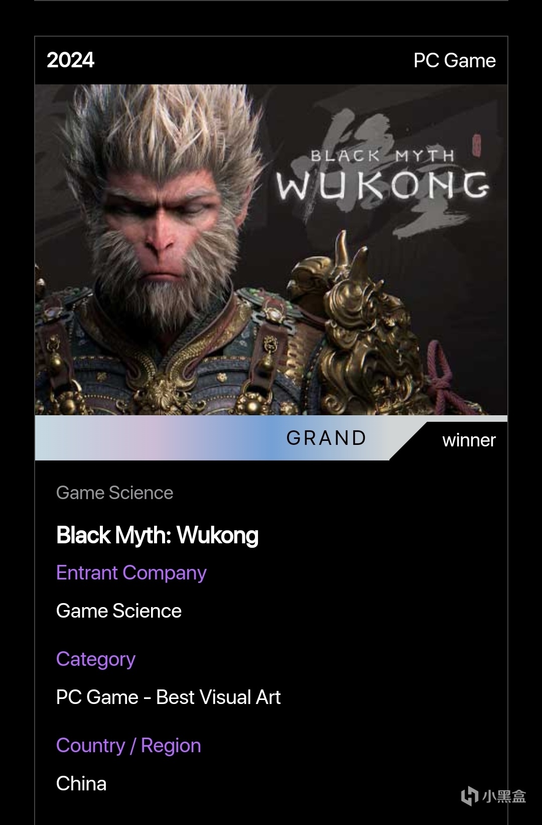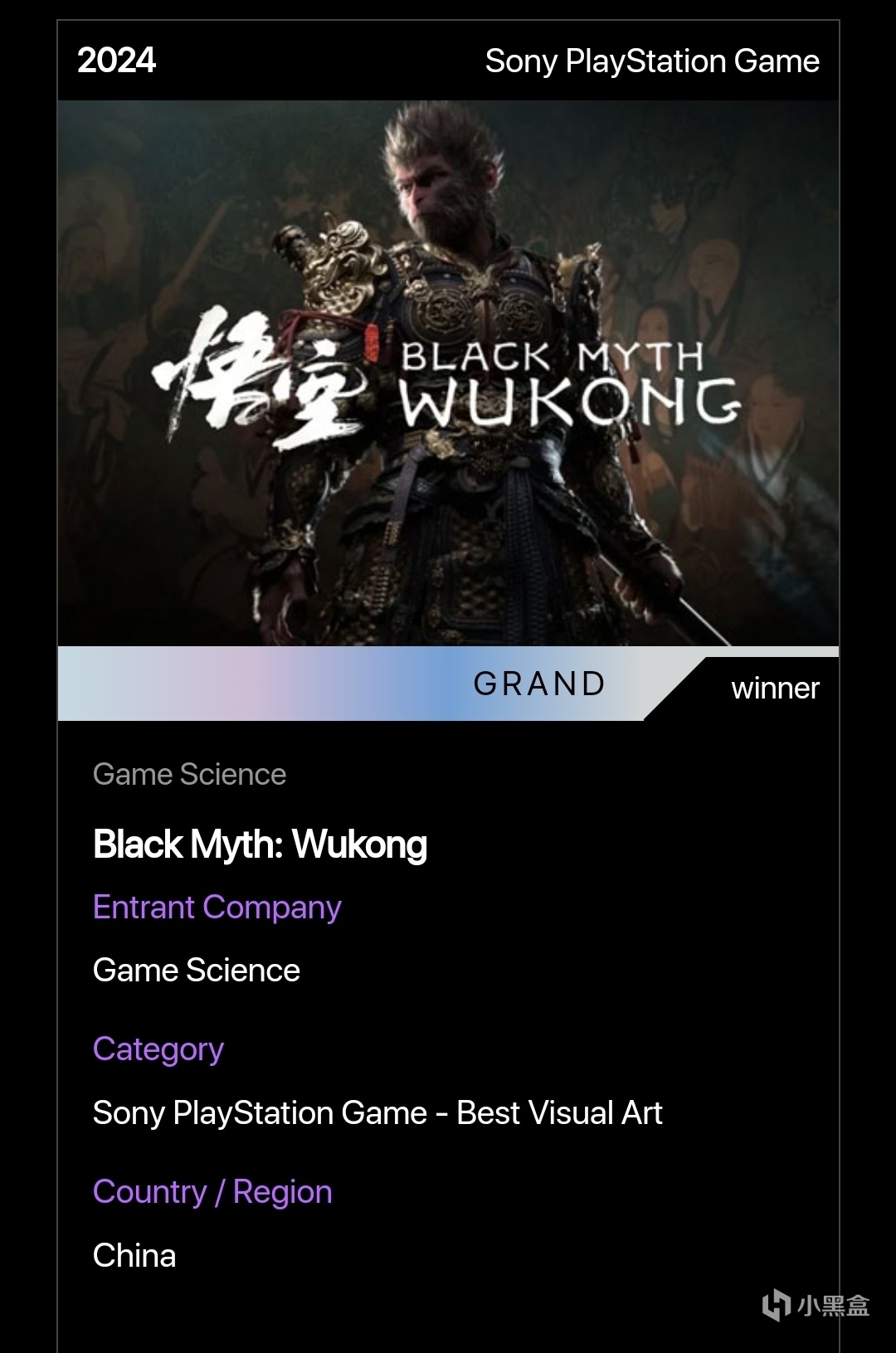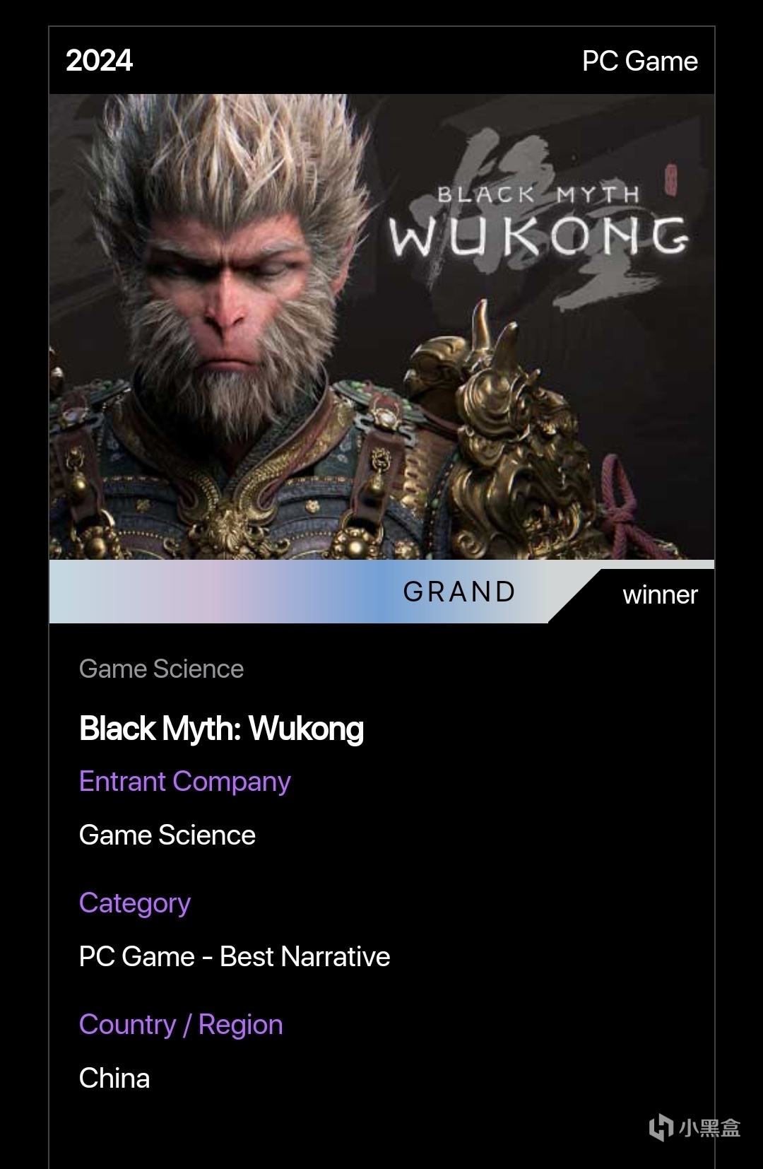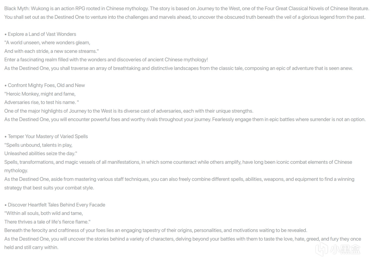 官網對黑神話悟空的介紹也是頒獎詞