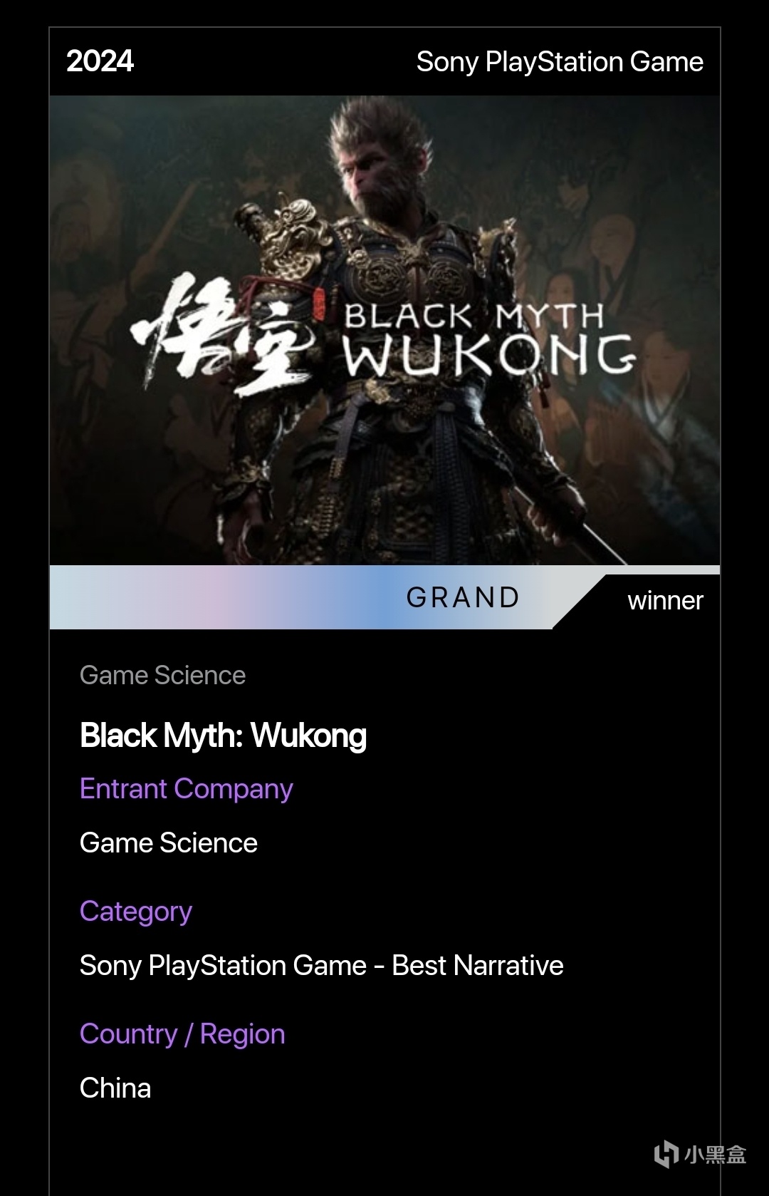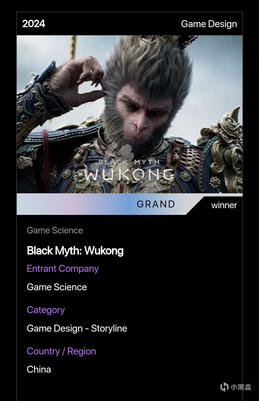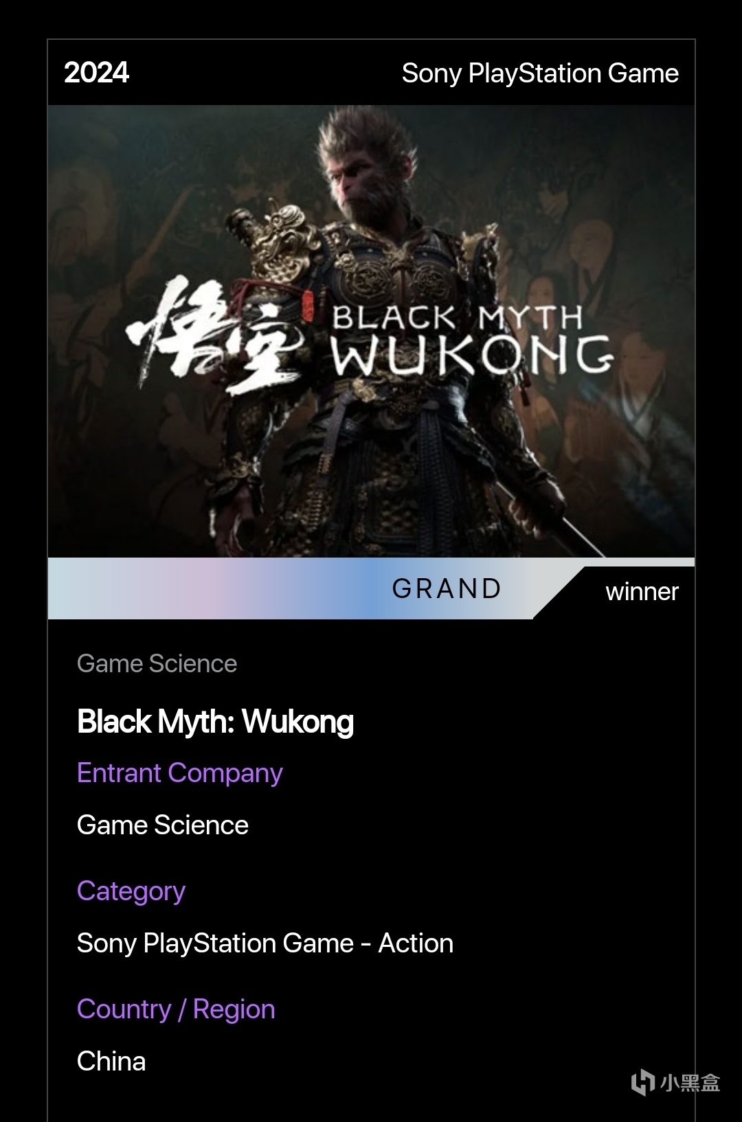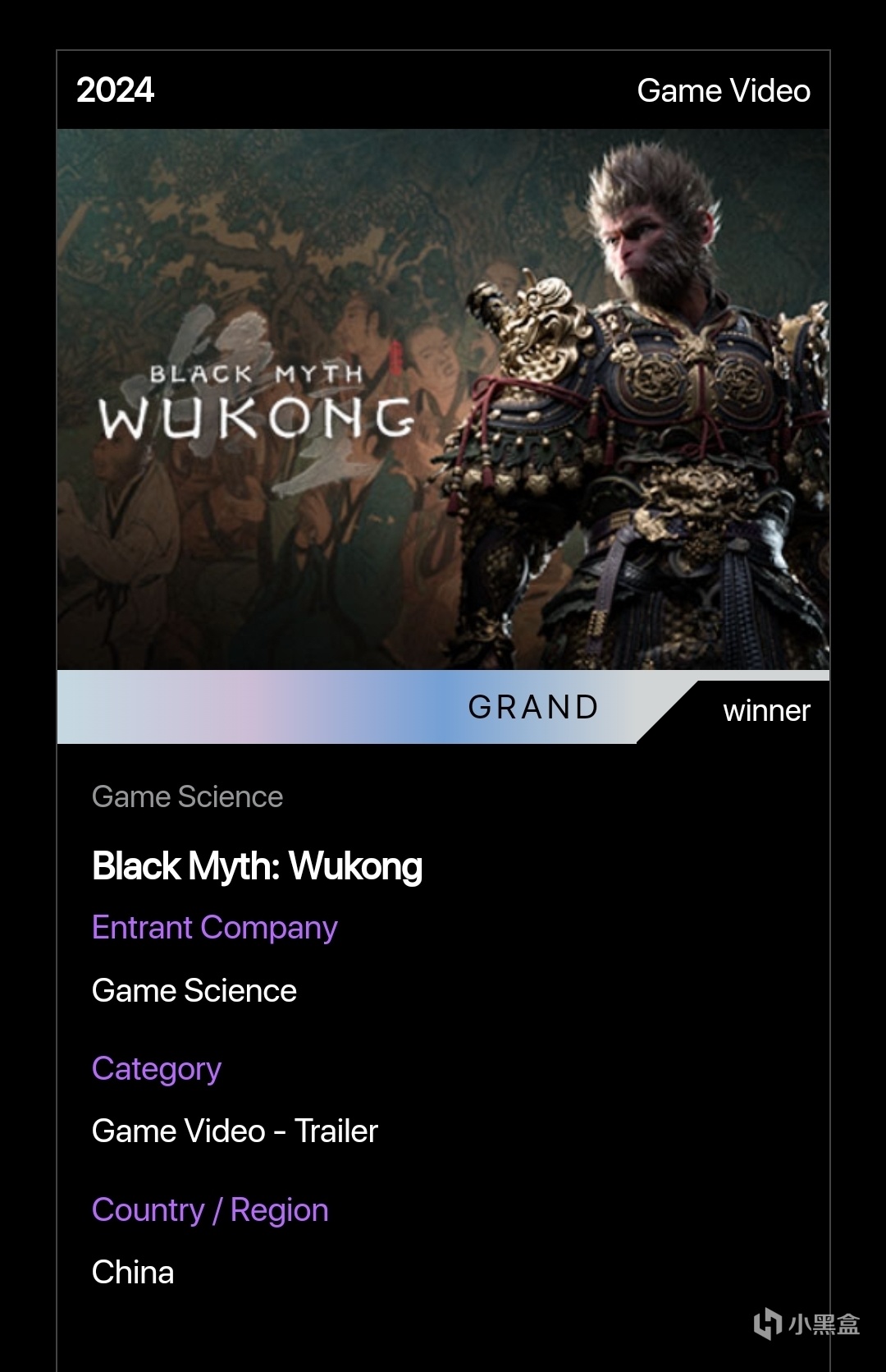 官網對黑神話悟空的介紹也是頒獎詞
