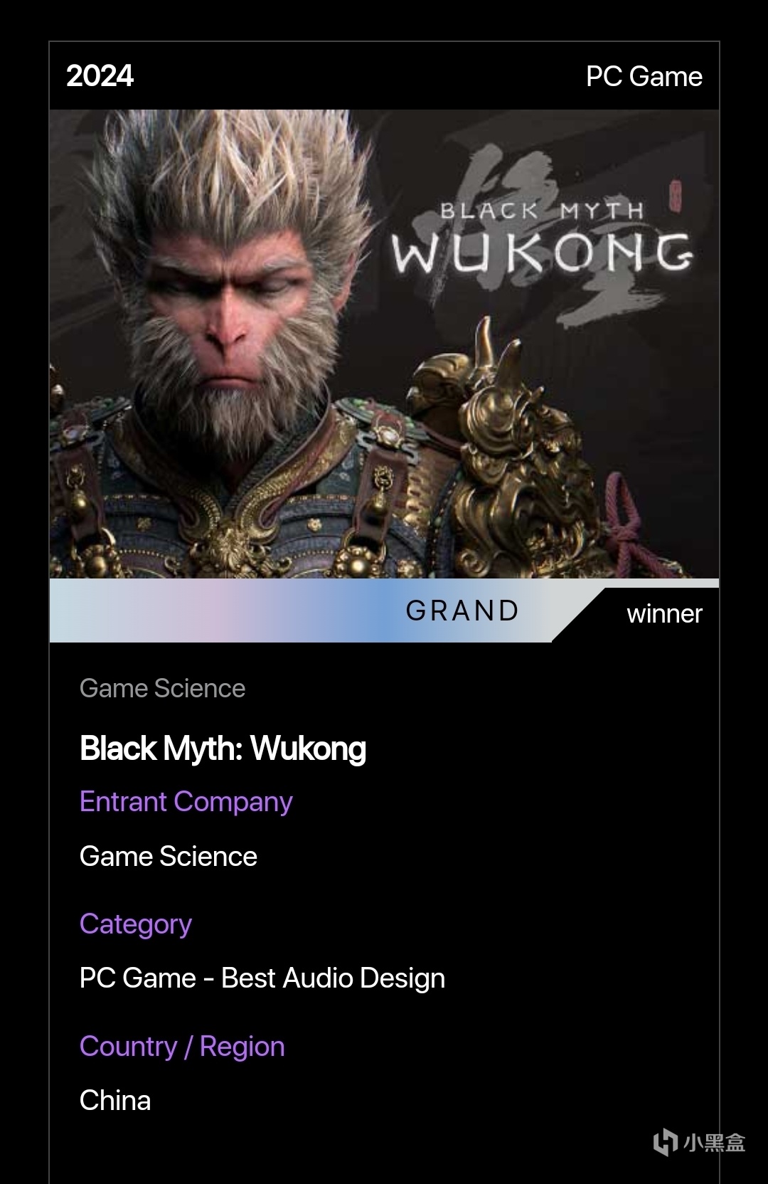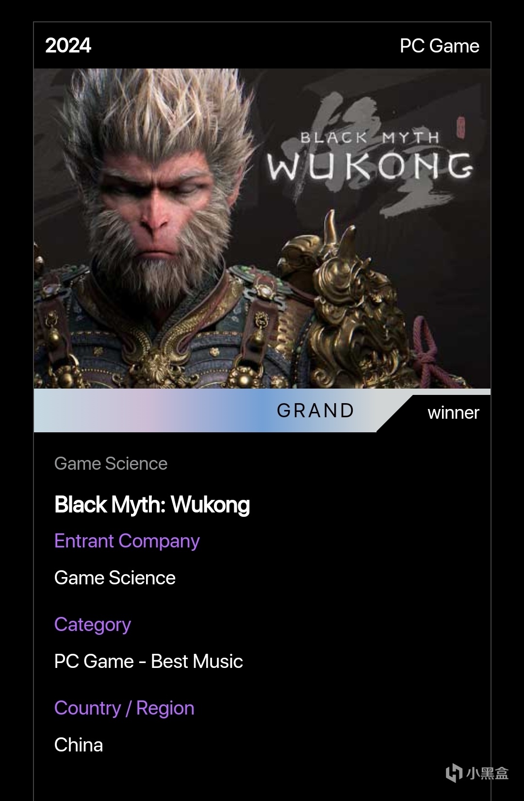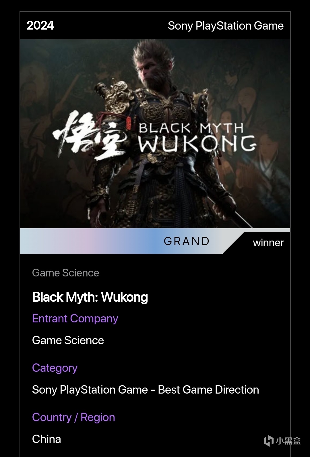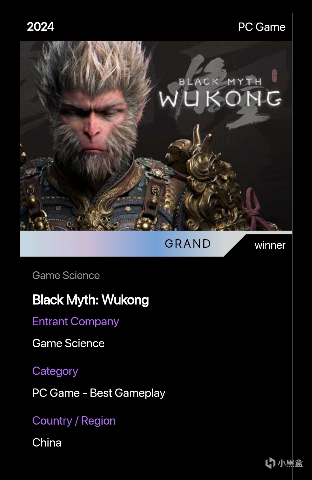官網對黑神話悟空的介紹也是頒獎詞