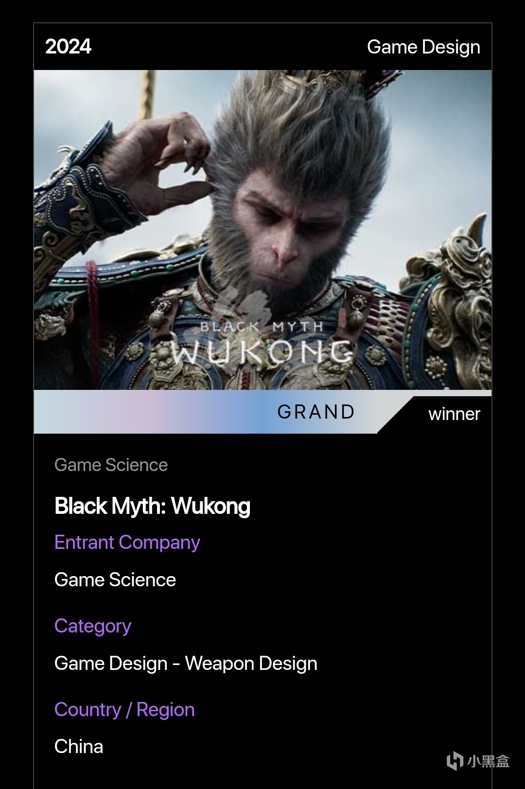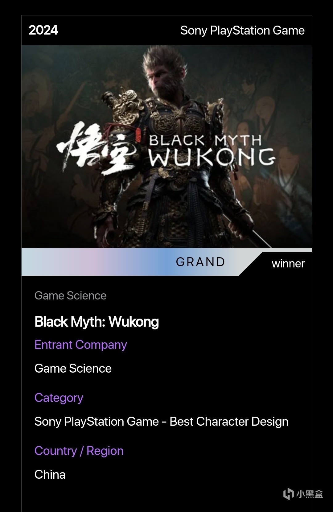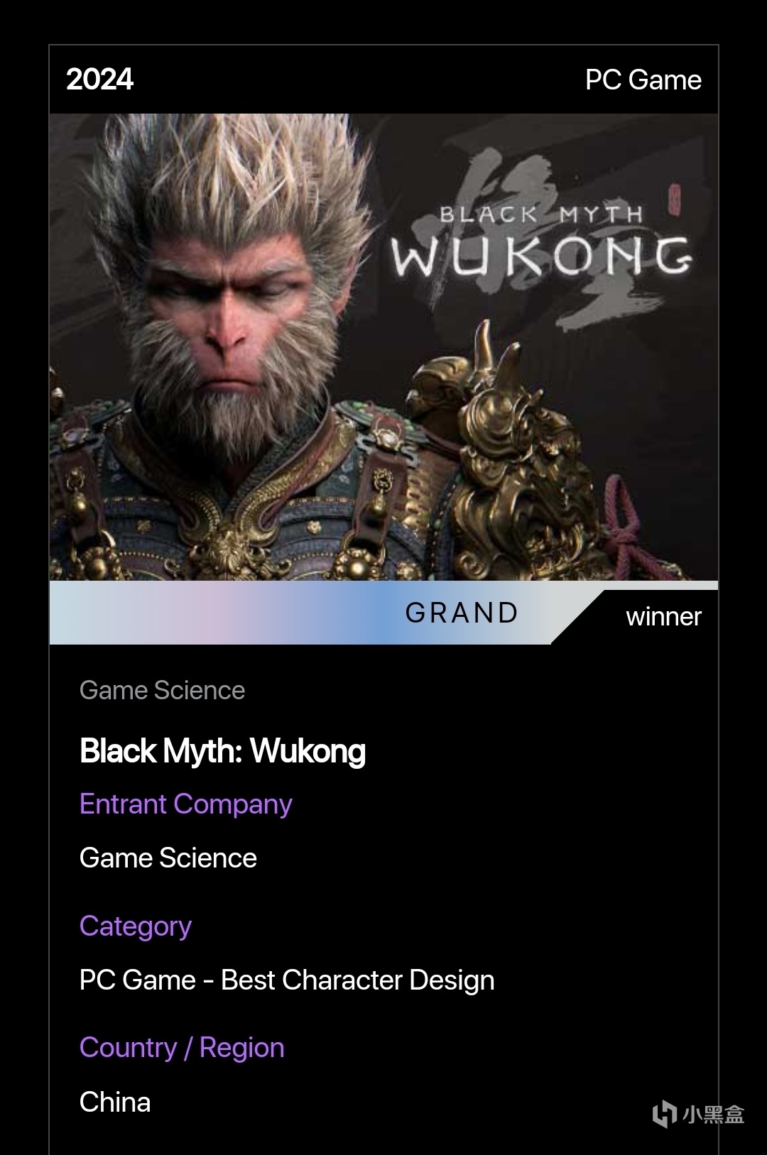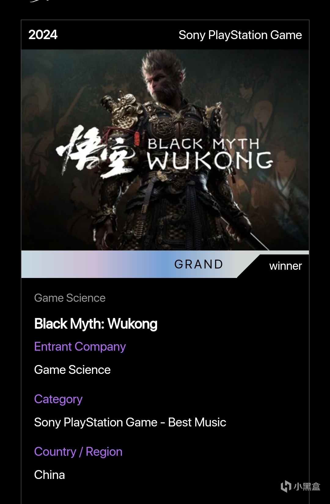 官網對黑神話悟空的介紹也是頒獎詞