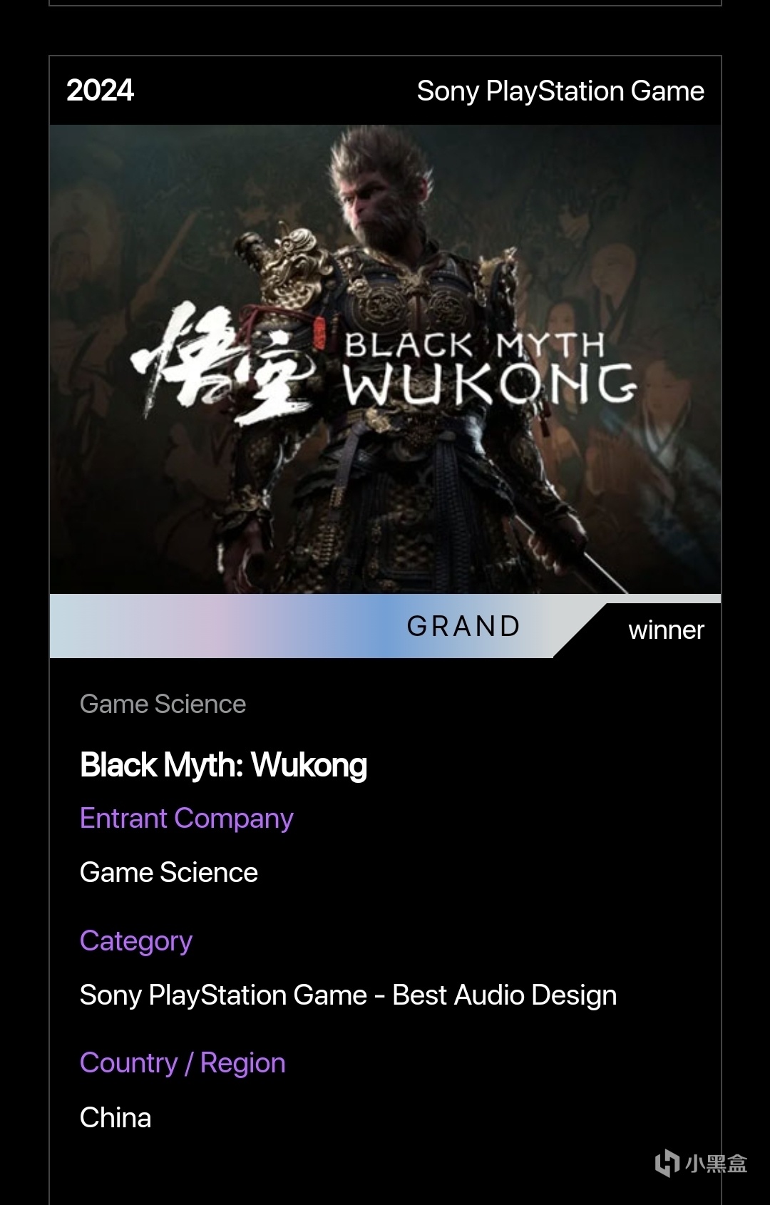 2024年NYX遊戲大獎上,黑神話共獲得四個類別共30個獎項。其中PC遊戲類獲得11項大獎包括終極大獎年度最佳遊戲、最佳動作遊戲、最佳遊戲設計、最佳表演、最佳角色設計、最佳視覺藝術、最佳敘事、最佳藝術指導、最佳原聲音樂、最佳音效設計、最佳遊戲玩法;PS遊戲類獲得12項大獎包括最佳動作遊戲、最佳角色扮演遊戲、最佳表演、最佳角色設計、最佳視覺藝術、最佳敘事、最佳藝術指導、最佳原聲音樂、最佳音效設計、最佳遊戲設計、最佳遊戲玩法、最佳遊戲指導;遊戲設計類獲得6項大獎包括最佳創意設計(key art)、最佳環境設計、最佳角色設計、最佳故事情節、最佳怪物設計、最佳武器設計;遊戲視頻類獲得1項大獎最佳預告片。