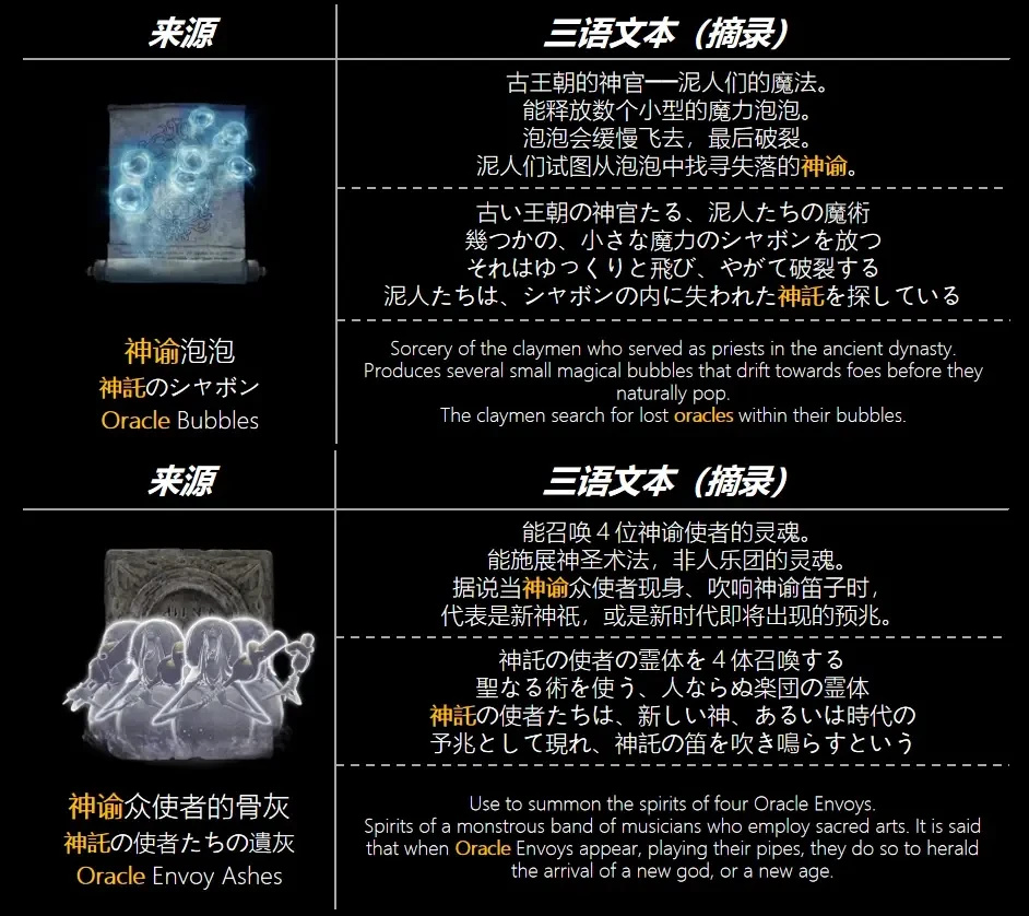 古王朝文明的泥人和神諭使者所吹出的“泡泡”都是尋找並迎接神諭。其中,神諭(神託、Oracle)這一特殊的專有詞只在這兩種生物的文本中出現。因此我認爲泥人們的神諭同樣是指米凱拉