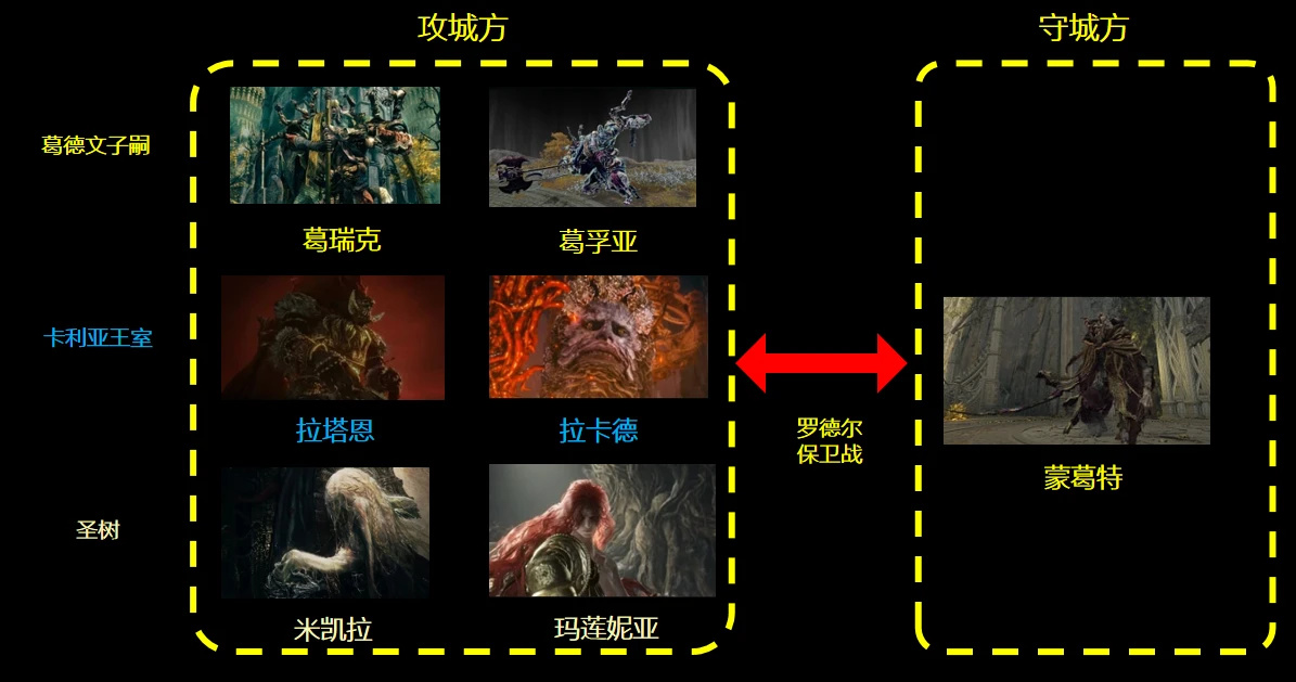 接下來我們再看攻城方,他們叫做君王聯軍(Sovereign Alliance),顧名思義,就是由各個“碎片君王”聯合起來組建的一支聯盟。這些碎片君王都屬於瑪莉卡的子嗣。