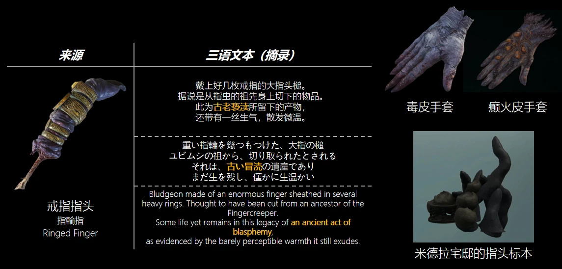 在格密爾墓地獲取的戒指指頭中的信息可以瞭解到,指蟲一直都與褻瀆的概念強掛鉤。更確切地說,是與叄指有關。而基於前面幾期的分析,叄指就是在交界地上,所謂褻瀆與癲火的共同起源。