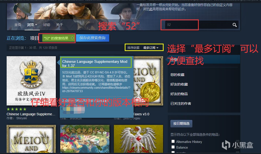 1)創意工坊,在搜索框中搜索 “52”,選擇“最多訂閱”可以更方便搜索,搜索時需仔細觀察mod的版本號和你遊玩的版本相同。