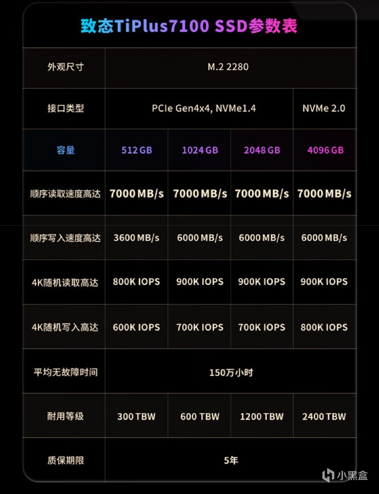单面颗粒,且带有LPDDR4 DRAM独立缓存,按每TB/1G分配。官方标称顺序读取可达7000MB/S,写入为6500MB/S。