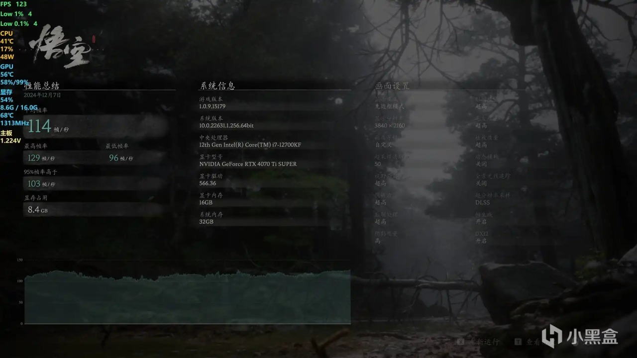 ▼首先还是本土出圈大作黑神话.悟空,设置方面,4K分辨率 + DLSS 性能 + 帧生成 ,阴影、特效、毛发、光照设为“中”,其他所有都是“影视级”,帧率达到 114FPS ,最低帧率 96FPS,1%Low 帧率 100FPS,此时显卡占用 70% 左右,而 CPU 占用不到 40%,画质和流畅性都能保证。