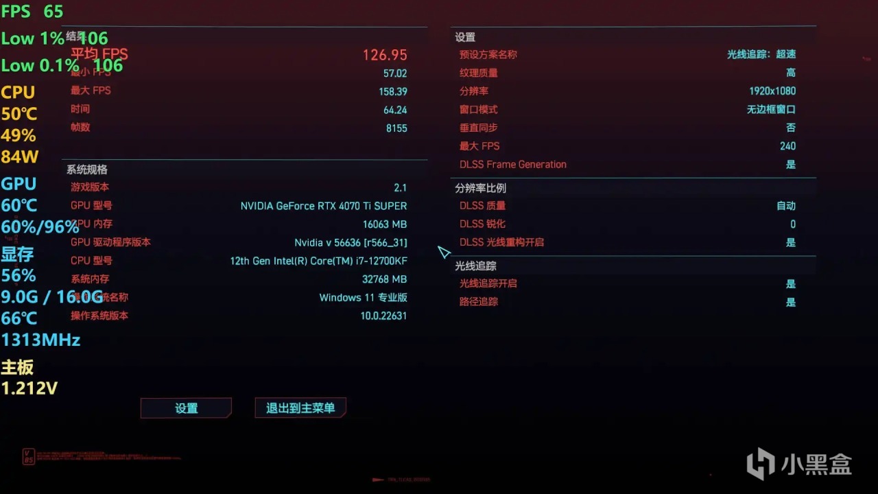 ▼再来看看赛博 2077的表现,这游戏虽然也吃显卡,但对处理器的要求更高。比较难得的是,这游戏是少有的同时支持 INA 三家超分辨率技术,而且也是最早支持英伟达 DLSS 3.5,DLSS 光线重构功能的游戏之 一。