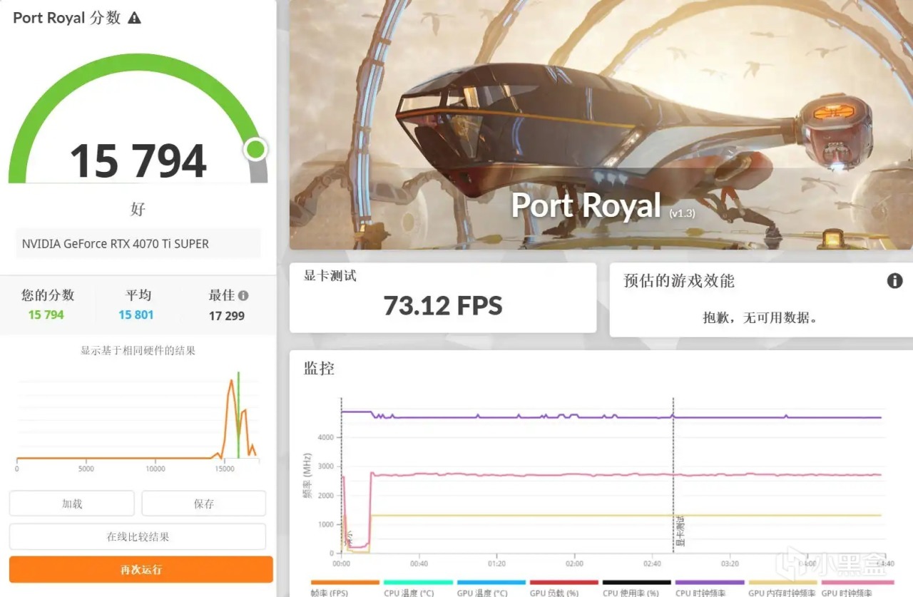 ▼光追性能测试 Port Royal ,整机得分 15794;显卡测试 73.12FPS