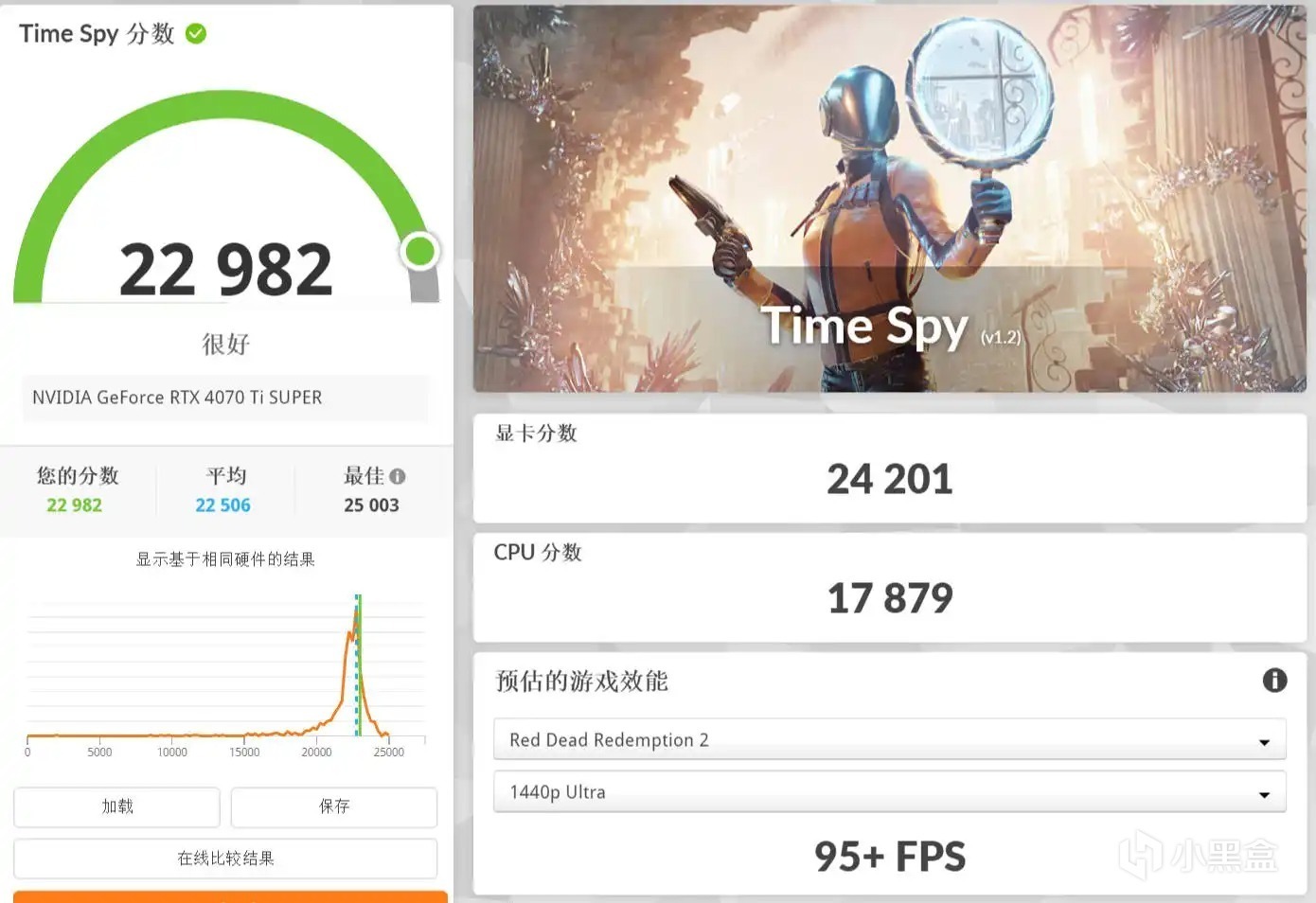 ▼3D Mark Time Spy 性能测试,这也是最能代表显卡实际游戏性能的分数,主要反映显卡在 1080P 分辨率下 DX12 性能。实测下来总得分为 22982 分,其中显卡分数 24201分,CPU 分数 17879,预估在【荒野大镖客2】可跑到 95+FPS 以上的好成绩。