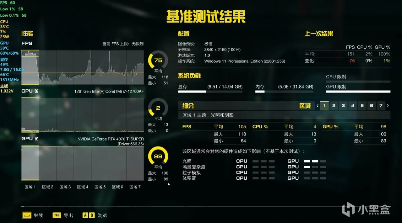 ▼游戏设置 4K 分辨率 + 最高画质,利用游戏内置的基准测试功能,平均帧率 75FPS ,CPU 占用 13%,GPU 占用 47%。