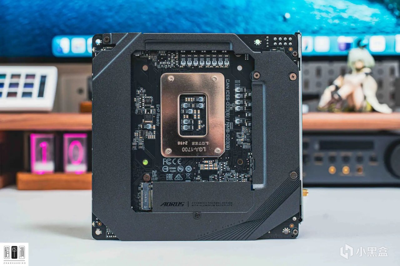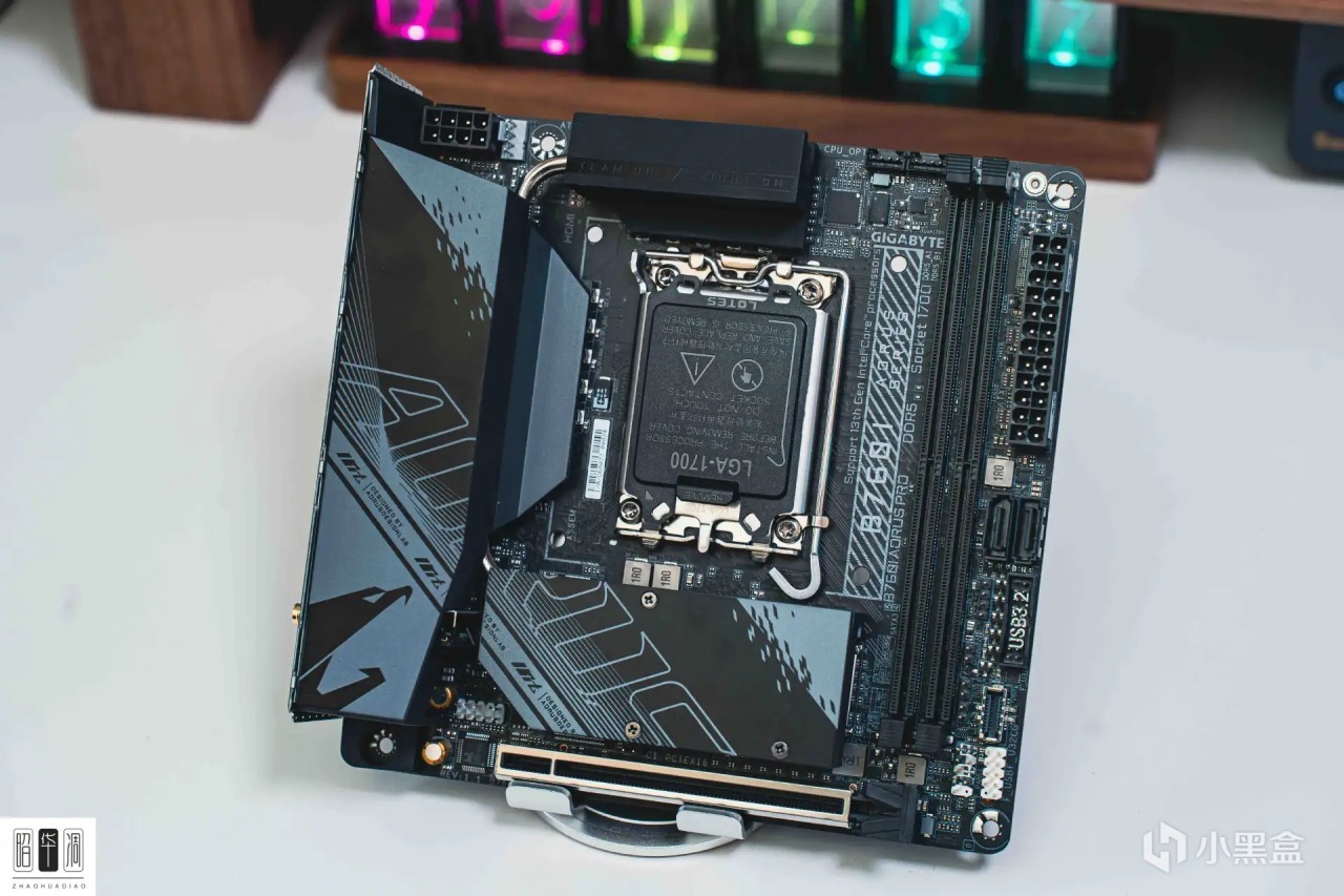 ▼机箱仅支持 ITX 版型,这里采用的技嘉 B760I AORUS PRO,供电强堆料猛。最关键的是,技嘉主板全系搭载的“高带宽低延迟模式”堪称残暴,同规格的性能表现远超友商,白嫖的性能不要白不要。要说不足的话,没有白色板算是个不小的遗憾。