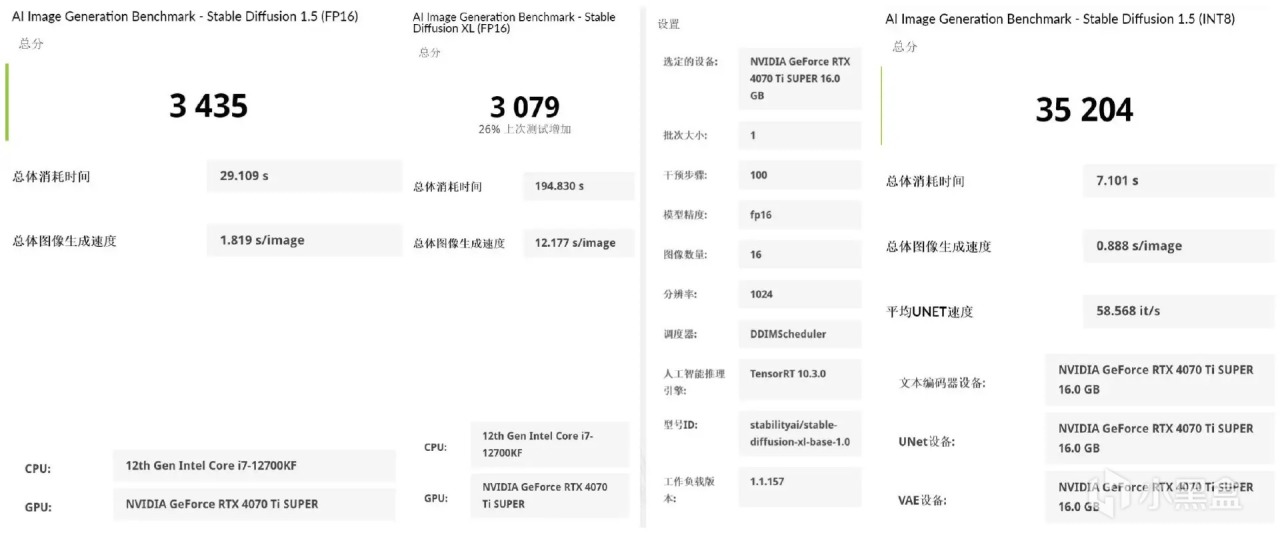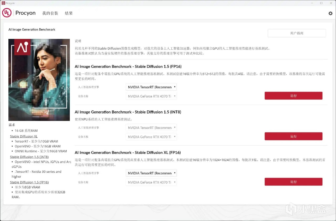 ▼生产力方面主要是针对 AI 的测试,首先是 UL Procyon 基准测试 ,这是 ULSolutions(3DMARK 母公司)出品的、面向专业人士的测试软件,包括 MicrosoftOffice 生产力性能测试、PS / LR 性能测试、以及基于 Stable Diffusion 模型,专门用于测量高端硬件 AI 性能基准工具。