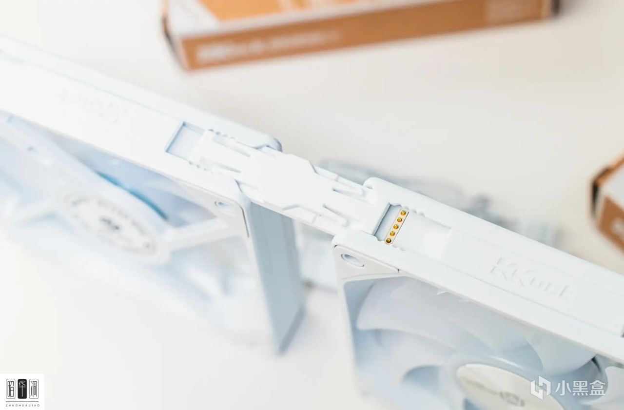 ▼拼接积木风扇无疑是最适合小机箱的组合,机械大师卡卡 KL120 就是采用的这种结构。不过风扇将金属导电连接片采用滑动卡扣的设计, 8 档缝隙可调,这也意味着风扇之间无需紧密贴合,灵活性更高。