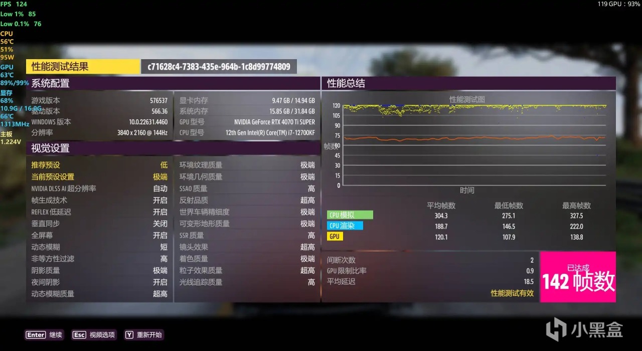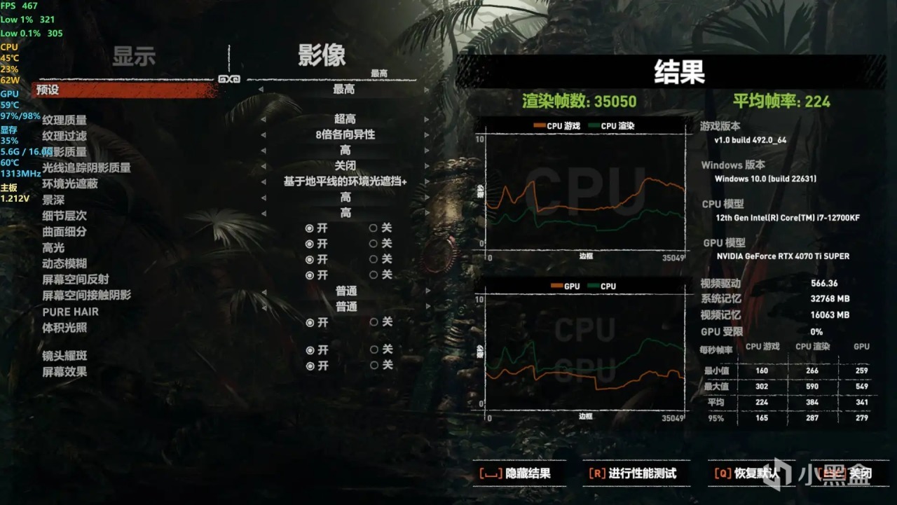 测试基于 1080 分辨率 + DLSS 质量 + 最高画质,游戏帧数 224FPS 。不过测试结果有点问题,这里显示的 GPU 受限 0%。