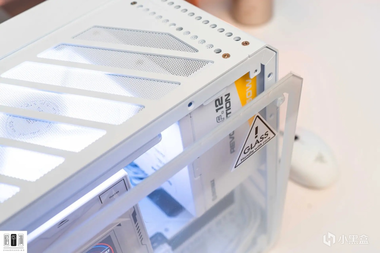 ▼机箱左侧板为 3mm 透明钢化玻璃,不过右侧板就变化较大,以前是近乎整版的狭长开孔,现在仅仅在下方做了平行四边形开孔(对应显卡区域),也基本确认机箱走的上下风道。机箱依旧保留了手拧合金螺帽的固定方式,相当美观。