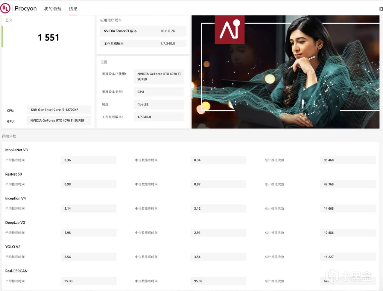 ▼这里选用 AI 图像生成测试, 推理设备类型选择 GPU 进行加速,精度标准选择 float32。最后得分 1551,不同模型耗时如图