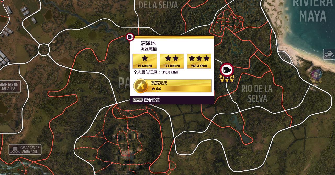 测速点位于地图右下角的雨林中,从上下两端开始加速均可完成目标(下端更容易些)。