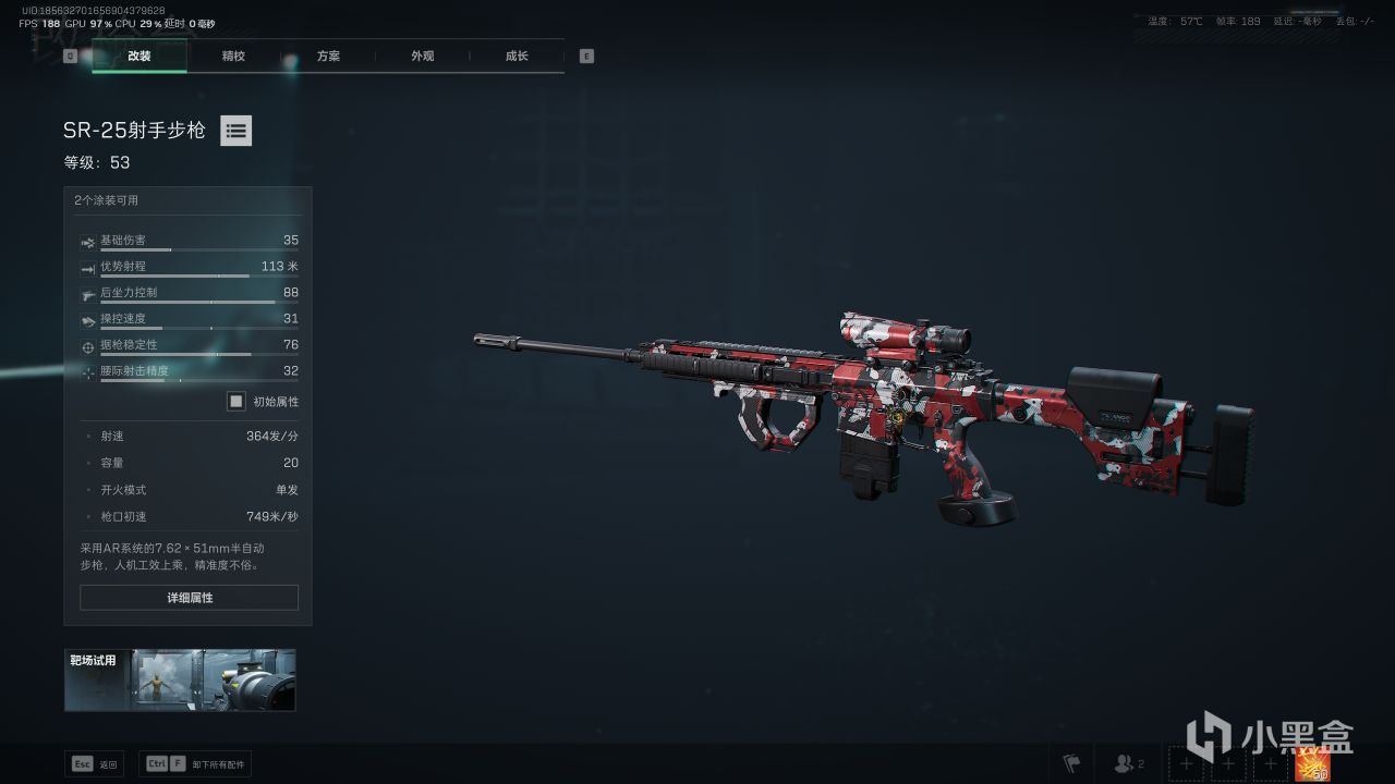 SR25虽然看似面板属性极佳,但糟糕的连射弹道还是让它体验不佳,同时弹速过低也是个大问题,不过优点是射速较快,并且AR平台可改件多,想怎么改就怎么改,但策划不知道是发了什么颠,装上改进护木后就无法安装共振/沙暴握把,权衡之下我还是选择舍弃了改进护木那点蚊子腿属性,下面是改装方案