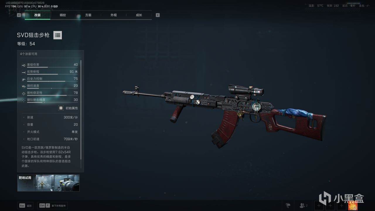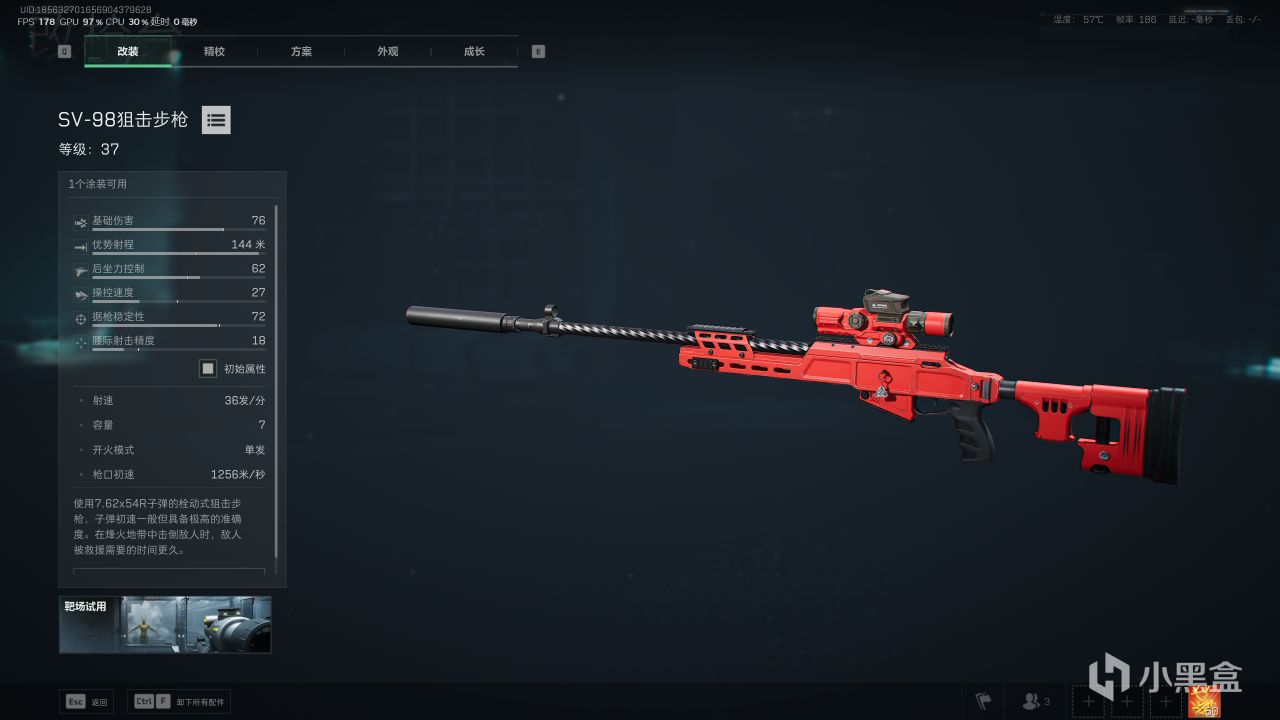 新手第一把栓狙作用就是让新手快速了解栓狙纯陷阱,SV98依旧是老问题,可改件少、弹匣小、属性不佳,不过改装后弹速是全游戏第二,但还是没卵用,改不了后托和握把就是飞舞一个