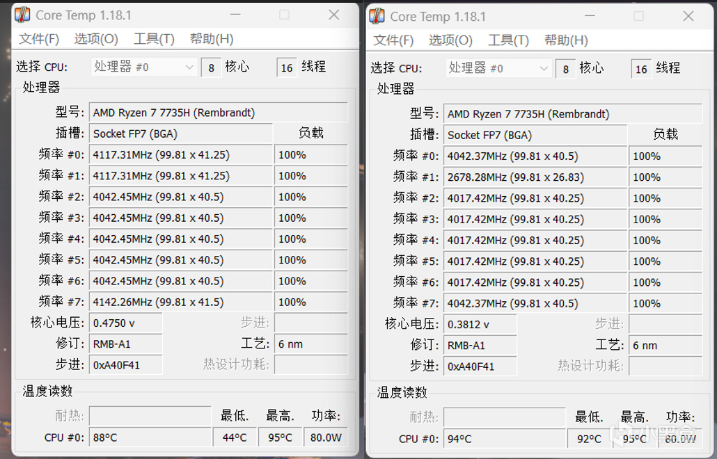 可以看到相变硅脂(左)和原厂硅脂(右)相比,CPU频率也更高一些